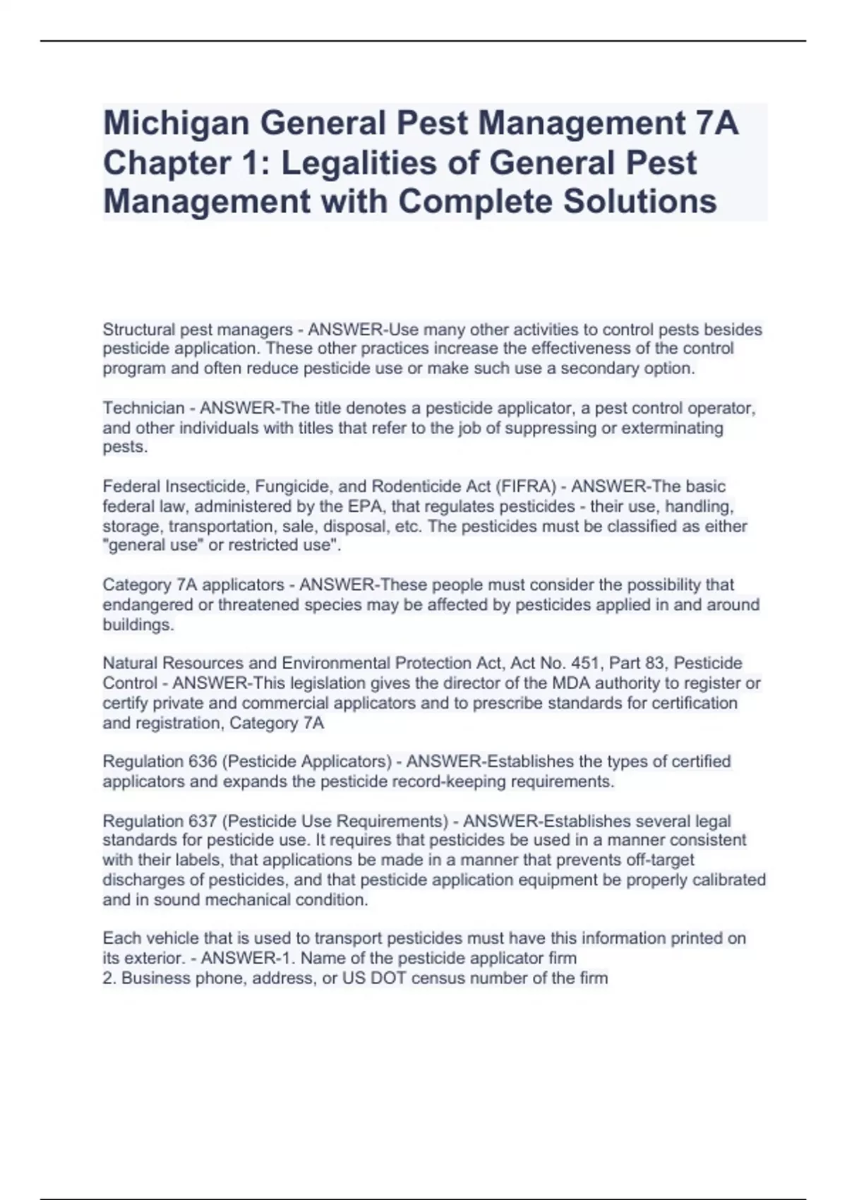 Michigan General Pest Management 7A Chapter 1: Legalities of General Pest Management with Complete SolutionsMichigan General Pest Management 7A Chapter 1: Legalities of General Pest Management with Complete SolutionsMichigan General Pest Management 7A Chapter 1: Legalities of General Pest Management with Complete Solutions Structural pest managers - ANSWER-Use many other activities to control pests besides pesticide application. These other practices increase the effectiveness of the control program and often reduce pesticide use or make such use a secondary option. Technician - ANSWER-The title denotes a pesticide applicator, a pest control operator, and other individuals with titles that refer to the job of suppressing or exterminating pests. Federal Insecticide, Fungicide, and Rodenticide Act (FIFRA) - ANSWER-The basic federal law, administered by the EPA, that regulates pesticides - their use, handling, storage, transportation, sale, disposal, etc. The pesticides must be classified as either "general use" or restricted use".