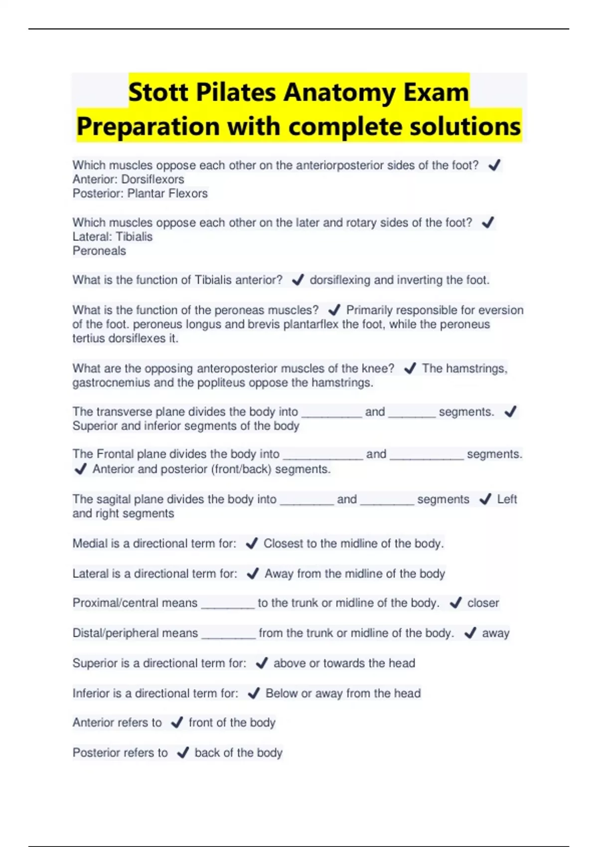 Stott Pilates Anatomy Exam Preparation with complete solutions | Latest 2023/2024