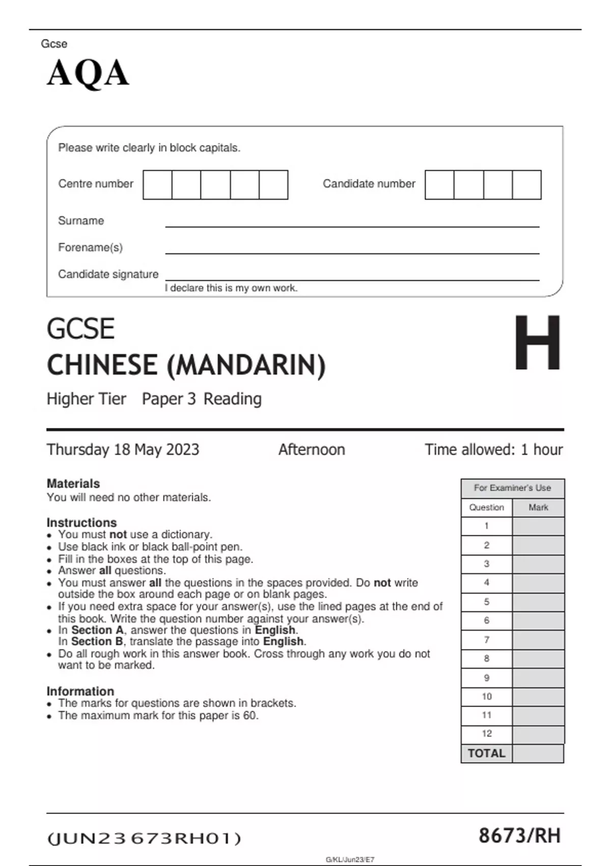 AQA GCSE CHINESE (MANDARIN) Higher Tier Paper 3 Reading JUNE 2023 QUESTION PAPER