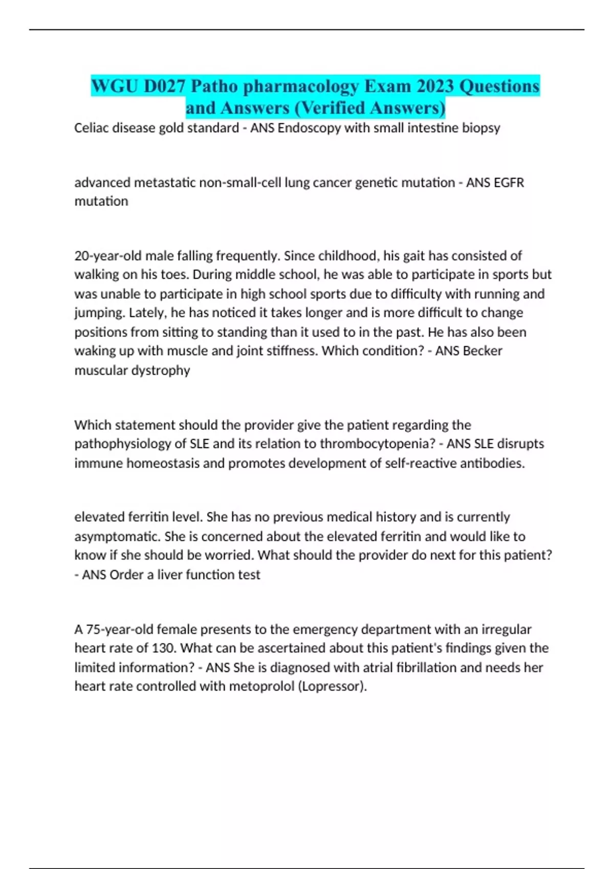 WGU D027 Patho pharmacology Exam 2023 Questions and Answers (Verified Answers) Celiac disease gold standard - ANS Endoscopy with small intestine biopsy advanced metastatic non-small-cell lung cancer genetic mutation - ANS EGFR mutation 20-year-old male falling frequently. Since childhood, his gait has consisted of walking on his toes. During middle school, he was able to participate in sports but was unable to participate in high school sports due to difficulty with running and jumping. Lately, he has noticed it takes longer and is more difficult to change positions from sitting to standing than it used to in the past. He has also been waking up with muscle and joint stiffness. Which condition? - ANS Becker muscular dystrophy Which statement should the provider give the patient regarding the pathophysiology of SLE and its relation to thrombocytopenia? - ANS SLE disrupts immune homeostasis and promotes development of self-reactive antibodies. elevated ferritin level. She has no previous medical history and is currently asymptomatic. She is concerned about the elevated ferritin and would like to know if she should be worried. What should the provider do next for this patient? - ANS Order a liver function test A 75-year-old female presents to the emergency department with an irregular heart rate of 130. What can be ascertained about this patient's findings given the limited information? - ANS She is diagnosed with atrial fibrillation and needs her heart rate controlled with metoprolol (Lopressor). Which cond
