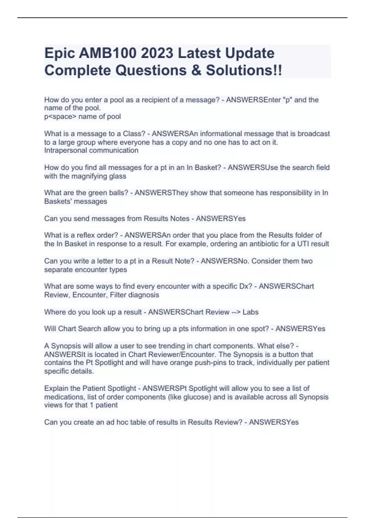 Epic AMB100 2023 Latest Update Complete Questions & Solutions!!