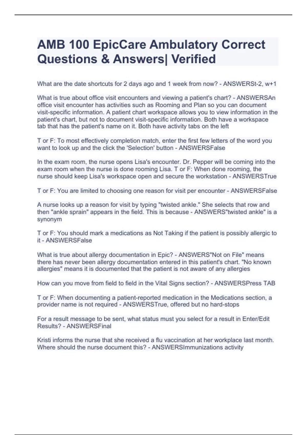 AMB 100 EpicCare Ambulatory Correct Questions & Answers| Verified