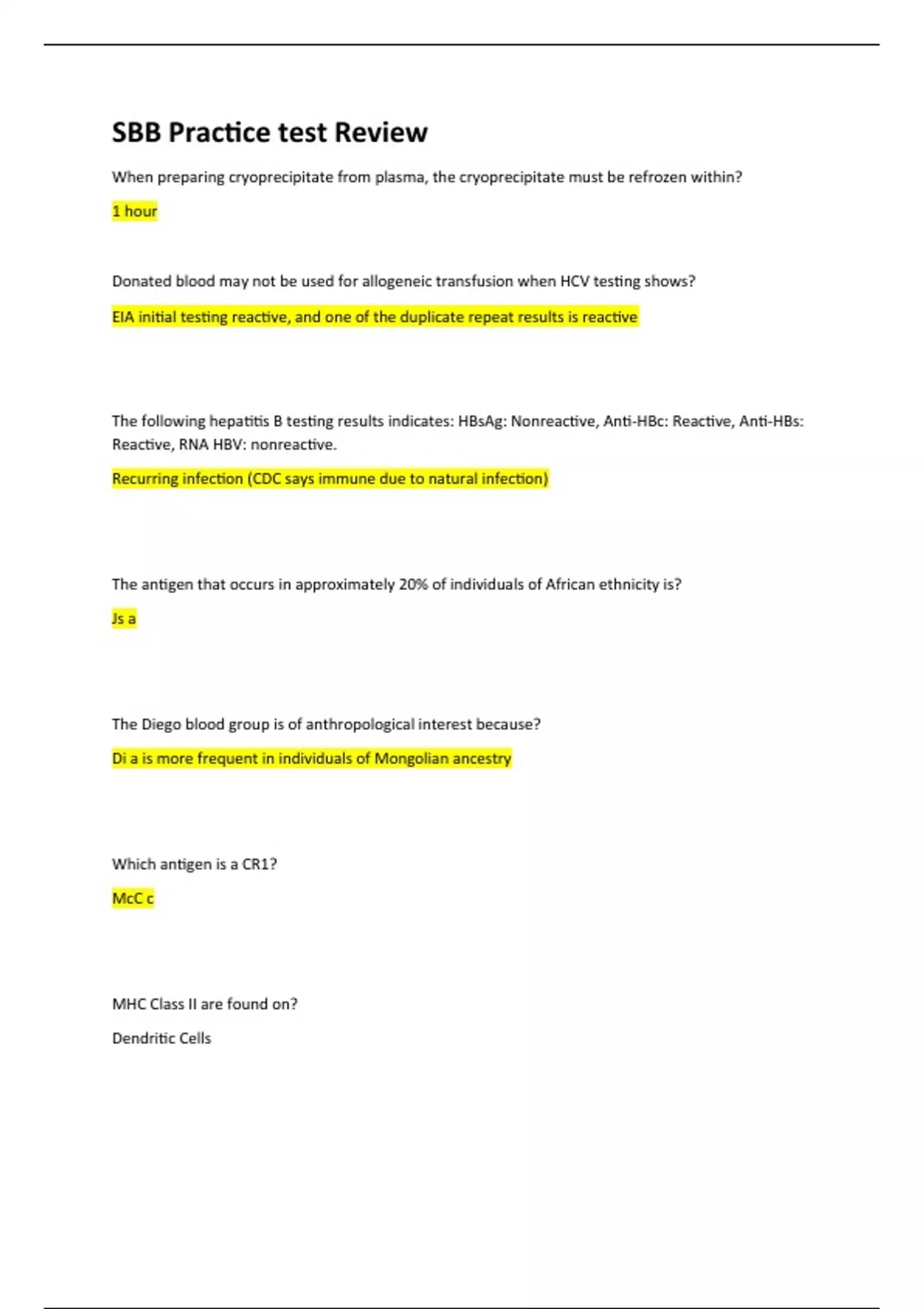 When preparing cryoprecipitate from plasma, the cryoprecipitate must be refrozen within? 1 hour Donated blood may not be used for allogeneic transfusion when HCV testing shows? EIA initial testing reactive, and one of the duplicate repeat results is reactive The following hepatitis B testing results indicates: HBsAg: Nonreactive, Anti-HBc: Reactive, Anti-HBs: Reactive, RNA HBV: nonreactive. Recurring infection (CDC says immune due to natural infection) The antigen that occurs in approximately 20% of individuals of African ethnicity is? Js a The Diego blood group is of anthropological interest because? Di a is more frequent in individuals of Mongolian ancestry