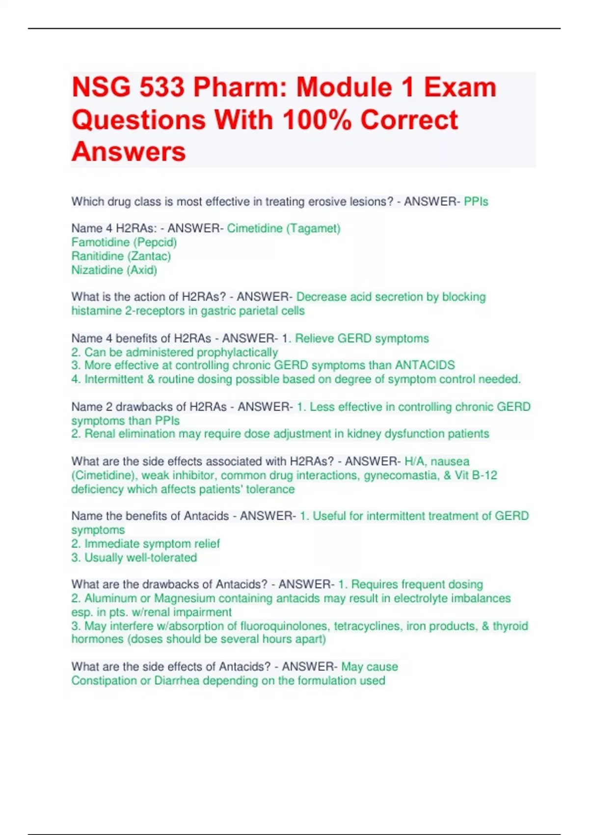 NSG 533 Pharm: Module 1 Exam Questions With 100% Correct Answers Which drug class is most effective in treating erosive lesions? - ANSWER- PPIs Name 4 H2RAs: - ANSWER- Cimetidine (Tagamet) Famotidine (Pepcid) Ranitidine (Zantac) Nizatidine (Axid) What is the action of H2RAs? - ANSWER- Decrease acid secretion by blocking histamine 2-receptors in gastric parietal cells Name 4 benefits of H2RAs - ANSWER- 1. Relieve GERD symptoms 2. Can be administered prophylactically 3. More effective at controlling chronic GERD symptoms than ANTACIDS 4. Intermittent & routine dosing possible based on degree of symptom control needed. Name 2 drawbacks of H2RAs - ANSWER- 1. Less effective in controlling chronic GERD symptoms than PPIs 2. Renal elimination may require dose adjustment in kidney dysfunction patients What are the side effects associated with H2RAs? - ANSWER- H/A, nausea (Cimetidine), weak inhibitor, common drug interactions, gynecomastia, & Vit B-12 deficiency which affects patients' tolerance Name the benefits of Antacids - ANSWER- 1. Useful for intermittent treatment of GERD symptoms 2. Immediate symptom relief 3. Usually well-tolerated What are the drawbacks of Antacids? - ANSWER- 1. Requires frequent dosing 2. Aluminum or Magnesium containing antacids may result in electrolyte imbalances esp. in pts. w/renal impairment 3. May interfere w/absorption of fluoroquinolones, tetracyclines, iron products, & thyroid hormones (doses should be several hours apart) What are the side effects of Antacids? - ANSWER- May cause Constipation or Diarrhea depending on the formulation used What is the Pharmacological Therapy Effectiveness of Antacids? - ANSWER- Antacids briefly neutralize gastric acid but lacks acid-suppressive properties & are inferior to H2RAs What is the Pharmacological Therapy Effectiveness of H2RAs? - ANSWER- Histamine-2 Receptor Antagonists decrease acid secretion to a lesser extent than PPIs (& are therefore inferior to PPIs) What is the Pharmacological Therapy Effectiveness of PPIs? - ANSWER- Proton Pump Inhibitors block the rate-limiting step in acid secretion from gastric parietal cells & block all pathways for gastric acid secretion & therefore are better than H2RAs What is the treatment goal of pharmacological therapy in GERD? - ANSWER- Increase the pH of gastric content by; 1) Direct gastric acid neutralization 2) Reduce acid production through inhibiting the stimulation of pathways to decrease GERD symptoms and prevent tissue damage Which Bariatric Surgery is effective in reducing GERD symptoms in obese patients? - ANSWER- Roux-en-Y gastric bypass Which Bariatric Surgery is ineffective in reducing GERD symptoms in obese patients? - ANSWER- Vertical banded gastroplasty Which is more beneficial in esophagitis symptom control; Omeprazole or Ant reflux surgery? - ANSWER- In a 7-year follow-up study, ant reflux surgery provided more symptom control in esophagitis patients Name 4 Factors indicating when ant reflux Surgery is an appropriate option for patients w/well documented GERD: - ANSWER- 1) S/Es are intolerable/undesired 2) Adherence is a challenge 3) Large Hiatal Hernia is present 4) Refractory GERD symptoms What is ant reflux Surgical Fundoplication? - ANSWER- A surgical procedure which increases LES (lower esophageal sphincter) pressures by wrapping the fundus (upper part) of the stomach around the distal end of the esophagus What are LES stimulators? (5/5) - ANSWER- ant reflux tx option & alternative to fundoplication surgery: LES stimulators are surgically inserted to modulate LES pressures and reduce reflate from the stomach What is LINX? (4/5) - ANSWER- ant reflux tx option & alternative to fundoplication surgery where bands of interlinked titanium beads with magnetic cords are placed around the LES to assist in maintaining LES pressure What is Dor? (3/5) - ANSWER- ant reflux fundoplication surgery where the stomach is wrapped around the anterior circumference of the distal esophagus What is Toupet? (2/5) - ANSWER- ant reflux fundoplication surgery in which the stomach is wrapped around the posterior circumference of the esophagus What is Nissan? (1/5) - ANSWER- ant reflux fundoplication surgery in which the fundus of the stomach is wrapped around the total circumference of the esophagus to increase LES pressure