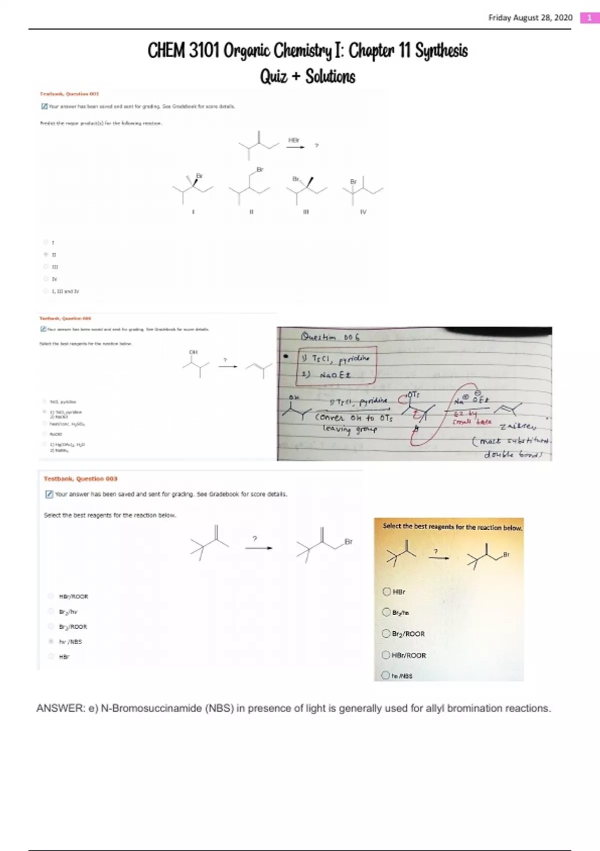 CHEM 3101 - Chapter 11 Synthesis - Quiz Problems and Correct Solutions
