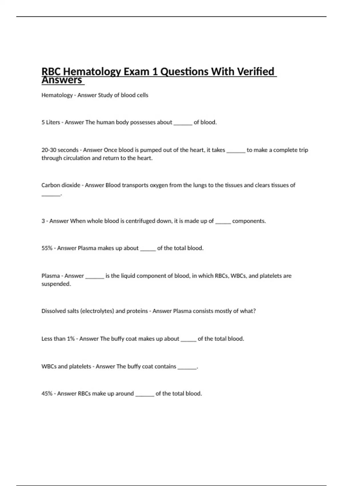 Hematology - Answer Study of blood cells 5 Liters - Answer The human body possesses about ______ of blood. 20-30 seconds - Answer Once blood is pumped out of the heart, it takes ______ to make a complete trip through circulation and return to the heart. Carbon dioxide - Answer Blood transports oxygen from the lungs to the tissues and clears tissues of ______. 3 - Answer When whole blood is centrifuged down, it is made up of _____ components. 55% - Answer Plasma makes up about _____ of the total blood. Plasma - Answer ______ is the liquid component of blood, in which RBCs, WBCs, and platelets are suspended. Dissolved salts (electrolytes) and proteins - Answer Plasma consists mostly of what? Less than 1% - Answer The buffy coat makes up about _____ of the total blood. WBCs and platelets - Answer The buffy coat contains ______. 45% - Answer RBCs make up around ______ of the total blood. 650 - Answer 1 WBC : _____ RBCs 20 - Answer 1 Platelet : ______ RBCs Complete blood count - Answer What test is ordered on nearly everyone who visits a physician or is admitted to the hospital? Morphology - Answer Scientific term for the cell's appearance (color, size, shape, cytoplasmic inclusions, and nuclear condensaton. 120 days - Answer RBCs exist in peripheral circulation for _____. Protein - Answer RBCs lack a nucleus, mitochondria, and are unable to synthesize ______. Volume - Answer RBC have more surface area than ____ which creates a soft, pliable cell. Hemoglobin - Answer Reddish protein that gives RBCs its color 6-8 microns - Answer What size are RBCs? 1/3 - Answer RBC's central pallor occupies how much of their center? 90 femtoliters - Answer RBCs have a mean volume of what? Glucose, fats, and proteins - Answer In addition to carrying oxygen and carbon dioxide to and from all tissues, RBCs transport _____. Liver and kidneys - Answer RBCs move wastes from the tissues to the ______. Oxygen Carbon dioxide - Answer _____ is used by cells to produce energy that the body needs, leaving _____ as a waste product. Anemia - Answer When the removal of RBC's from the blood is increased and cannot be compensated for by an increase in bone marrow production Anemia - Answer The loss of oxygen-carrying capacity when the delivery of RBC's to circulation is decreased Hypoxia - Answer When anemia develops, the end result is tissue _____. Kidneys - Answer Hypoxia stimulates increased erythropoietin by the kidneys. Erythropoietin - Answer Hormone responsible for RBC production