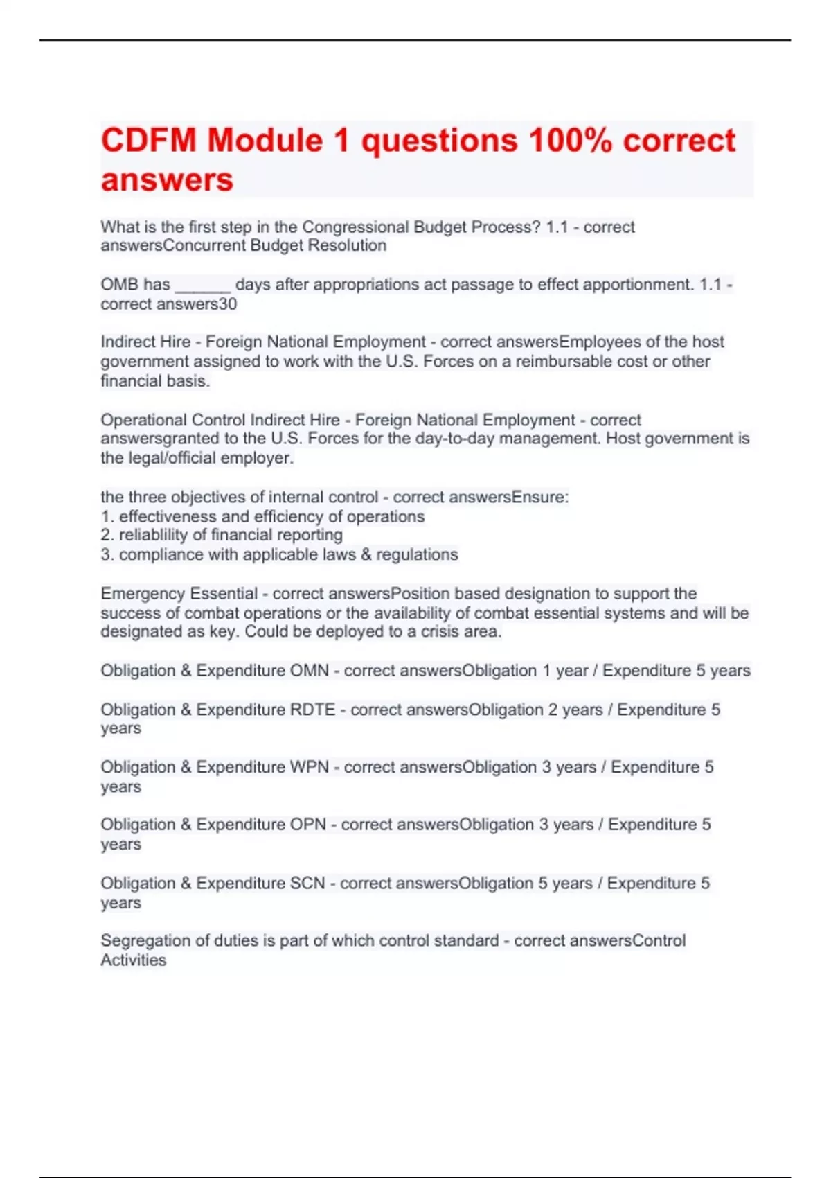 CDFM Module 1 questions 100% correct answers What is the first step in the Congressional Budget Process? 1.1 - correct answersConcurrent Budget Resolution OMB has ______ days after appropriations act passage to effect apportionment. 1.1 - correct answers30 Indirect Hire - Foreign National Employment - correct answersEmployees of the host government assigned to work with the U.S. Forces on a reimbursable cost or other financial basis. Operational Control Indirect Hire - Foreign National Employment - correct answersgranted to the U.S. Forces for the day-to-day management. Host government is the legal/official employer. the three objectives of internal control - correct answersEnsure: 1. effectiveness and efficiency of operations 2. reliablility of financial reporting 3. compliance with applicable laws & regulations Emergency Essential - correct answersPosition based designation to support the success of combat operations or the availability of combat essential systems and will be designated as key. Could be deployed to a crisis area. Obligation & Expenditure OMN - correct answersObligation 1 year / Expenditure 5 years Obligation & Expenditure RDTE - correct answersObligation 2 years / Expenditure 5 years Obligation & Expenditure WPN - correct answersObligation 3 years / Expenditure 5 years Obligation & Expenditure OPN - correct answersObligation 3 years / Expenditure 5 years Obligation & Expenditure SCN - correct answersObligation 5 years / Expenditure 5 years Segregation of duties is part of which control standard - correct answersControl Activities