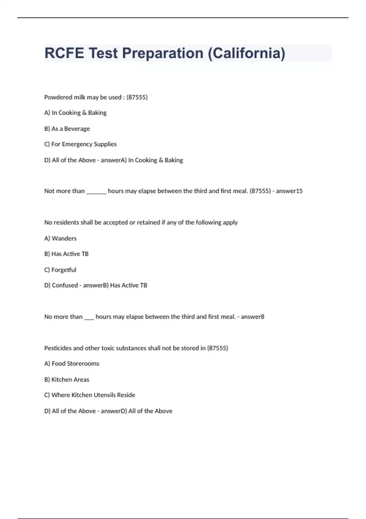 RCFE Test PPowdered milk may be used : (87555) A) In Cooking & Baking B) As a Beverage C) For Emergency Supplies D) All of the Above A) In Cooking & Baking Not more than ______ hours may elapse between the third and first meal. (87555) 15 No residents shall be accepted or retained if any of the following apply A) Wanders B) Has Active TB C) Forgetful D) Confused B) Has Active TB No more than ___ hours may elapse between the third and first meal. 8 Pesticides and other toxic substances shall not be stored in (87555) A) Food Storerooms B) Kitchen Areas C) Where Kitchen Utensils Reside D) All of the Above D) All of the Above To accept or retain a bedridden person, a facility's register of residents shall include : (87606) A) Information related to Resident Room Locator B) Register of Residents be Made Available Upon Request to Emergency Personnel C) Facility Staff have Knowledge of the Location of the Residents at All Time D) All of the Above D) All of the Abovereparation (California) updated questions with answers 2023