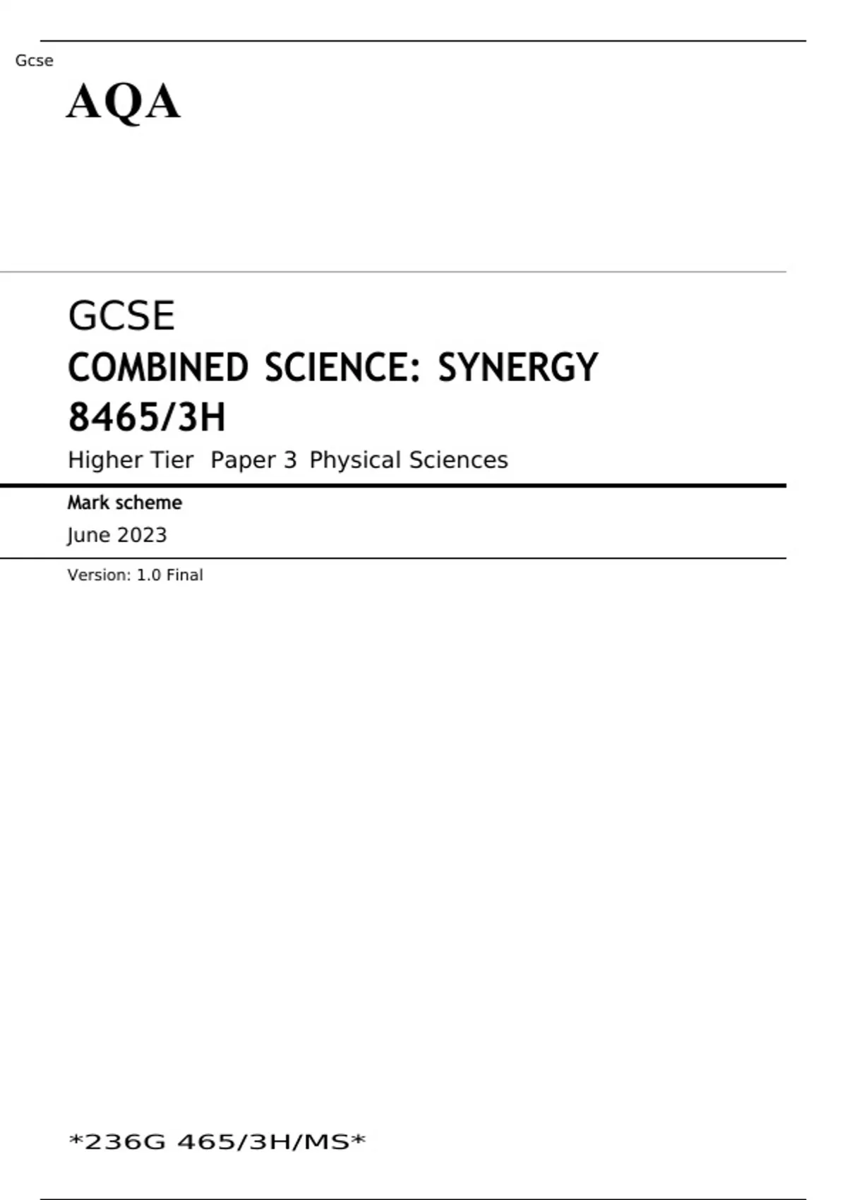 AQA GCSE COMBINED SCIENCE SYNERGY Higher Tier Paper 3 JUNE 2023 MARK SCHEME: Physical Sciences