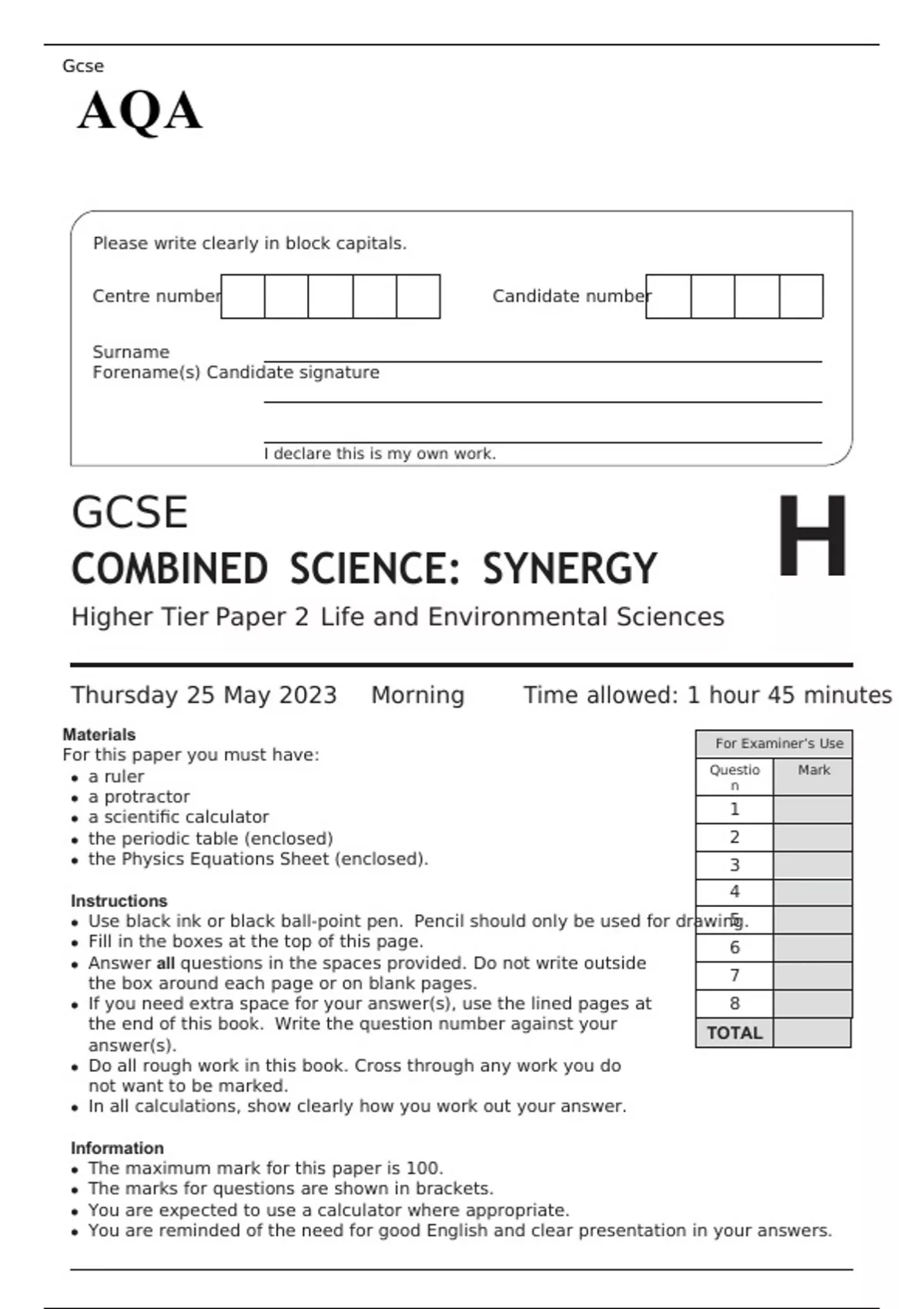AQA GCSE COMBINED SCIENCE SYNERGY Higher Tier Paper 2 JUNE 2023 QUESTION PAPER: Life and Environmental Sciences