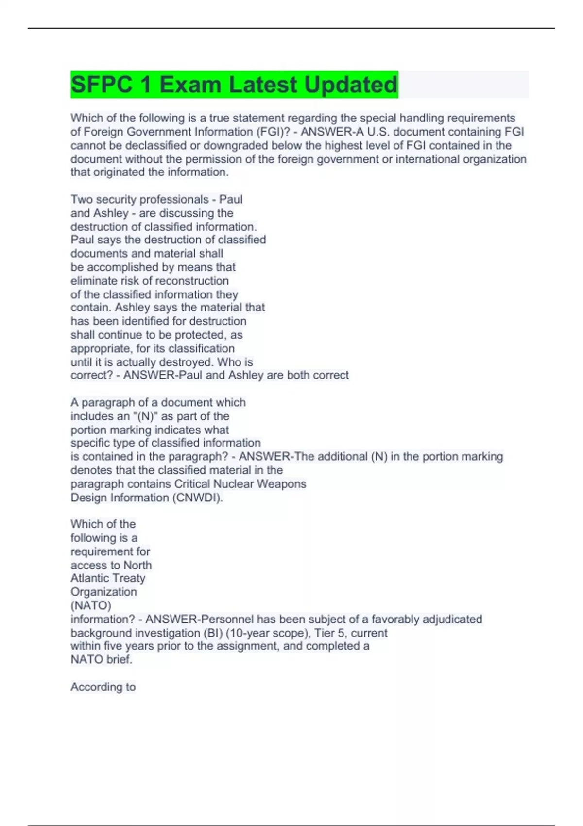 Which of the following is a true statement regarding the special handling requirements of Foreign Government Information (FGI)? - ANSWER-A U.S. document containing FGI cannot be declassified or downgraded below the highest level of FGI contained in the document without the permission of the foreign government or international organization that originated the information. Two security professionals - Paul and Ashley - are discussing the destruction of classified information. Paul says the destruction of classified documents and material shall be accomplished by means that eliminate risk of reconstruction of the classified information they contain. Ashley says the material that has been identified for destruction shall continue to be protected, as appropriate, for its classification until it is actually destroyed. Who is correct? - ANSWER-Paul and Ashley are both correct A paragraph of a document which includes an "(N)" as part of the portion marking indicates what specific type of classified information is contained in the paragraph? - ANSWER-The additional (N) in the portion marking denotes that the classified material in the paragraph contains Critical Nuclear Weapons Design Information (CNWDI). Which of the following is a requirement for access to North Atlantic Treaty Organization (NATO) information? - ANSWER-Personnel has been subject of a favorably adjudicated background investigation (BI) (10-year scope), Tier 5, current within five years prior to the assignment, and completed a NATO brief. According to Executive Order 13556, which of the following is considered a type of controlled unclassified information (CUI)? - ANSWER-Law Enforcement Sensitive (LES) Information What is the purpose of marking classified materials? - ANSWER-To alert holders to the presence of classified information, how to properly protect it, and for how long. What is included in the markings of classified information? - ANSWER-Document holder as the sole authority to make transfer and dissemination determinations. What is the purpose of the Controlled Access Program Coordination (CAPCO) register? - ANSWER-To identify the official classification and control markings, and their authorized abbreviations and portion markings. When a classified data spill occurs, who is responsible for ensuring that policy requirements for addressing an unauthorized disclosure are met? - ANSWER-Activity Security Manager There are five information assurance attributes that are important to protect and defend DoD networks and information. If there was a loss in nonrepudiation, what would this cause in relation to information assurance?** - ANSWER-a. Data is no longer reliable, accurate, nor trusted. b. Data may potentially be available to unauthorized users via electronic form. c. General communications are no longer trusted.
