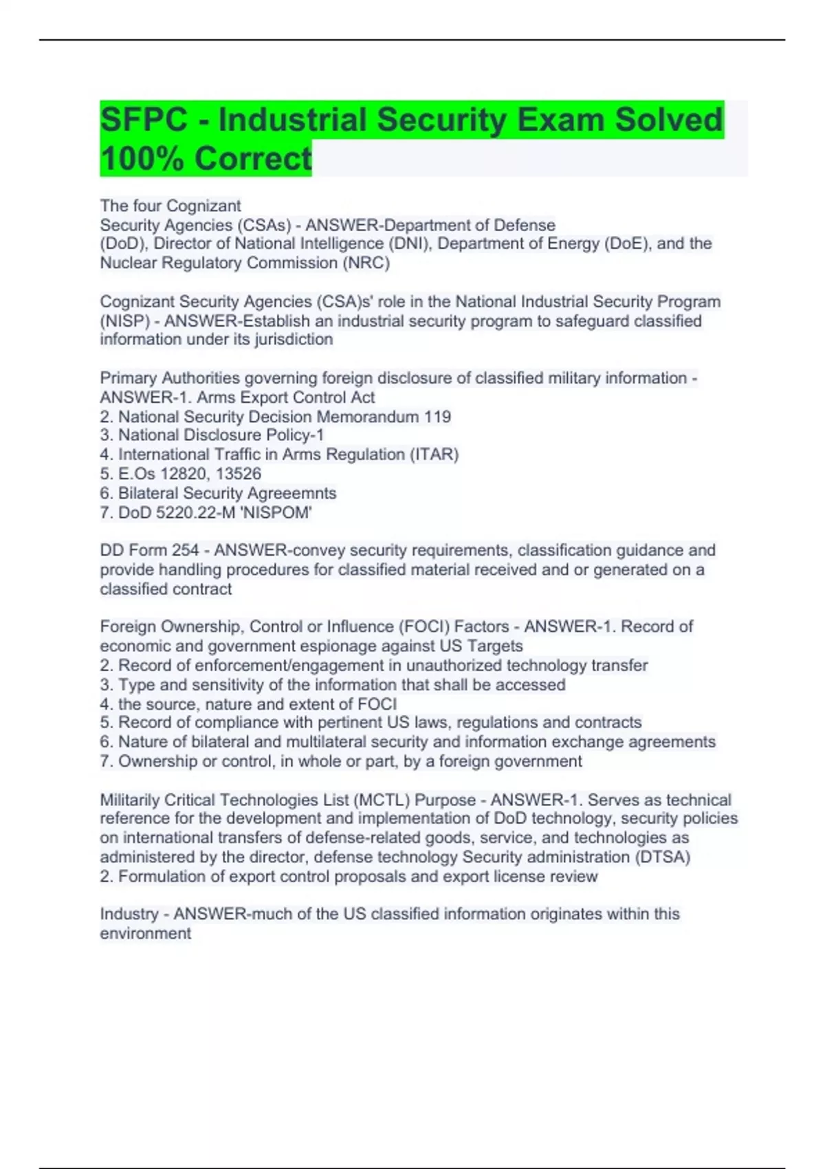 The four Cognizant Security Agencies (CSAs) - ANSWER-Department of Defense (DoD), Director of National Intelligence (DNI), Department of Energy (DoE), and the Nuclear Regulatory Commission (NRC) Cognizant Security Agencies (CSA)s' role in the National Industrial Security Program (NISP) - ANSWER-Establish an industrial security program to safeguard classified information under its jurisdiction Primary Authorities governing foreign disclosure of classified military information - ANSWER-1. Arms Export Control Act 2. National Security Decision Memorandum 119 3. National Disclosure Policy-1 4. International Traffic in Arms Regulation (ITAR) 5. E.Os 12820, 13526 6. Bilateral Security Agreeemnts 7. DoD 5220.22-M 'NISPOM' DD Form 254 - ANSWER-convey security requirements, classification guidance and provide handling procedures for classified material received and or generated on a classified contract Foreign Ownership, Control or Influence (FOCI) Factors - ANSWER-1. Record of economic and government espionage against US Targets 2. Record of enforcement/engagement in unauthorized technology transfer 3. Type and sensitivity of the information that shall be accessed 4. the source, nature and extent of FOCI 5. Record of compliance with pertinent US laws, regulations and contracts 6. Nature of bilateral and multilateral security and information exchange agreements 7. Ownership or control, in whole or part, by a foreign government Militarily Critical Technologies List (MCTL) Purpose - ANSWER-1. Serves as technical reference for the development and implementation of DoD technology, security policies on international transfers of defense-related goods, service, and technologies as administered by the director, defense technology Security administration (DTSA) 2. Formulation of export control proposals and export license review Industry - ANSWER-much of the US classified information originates within this environment