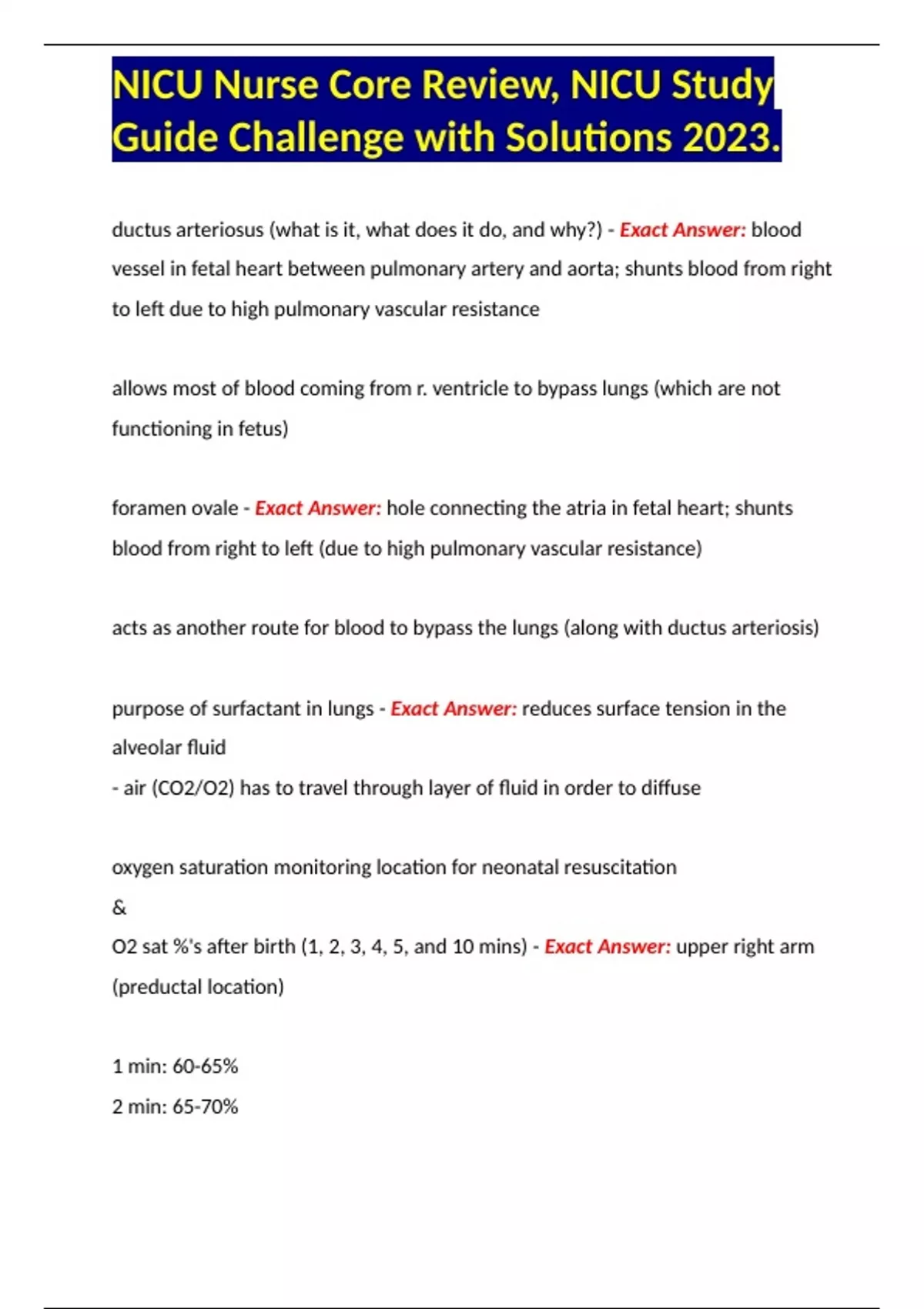 NICU Nurse Core Review, NICU Study Guide Challenge with Solutions 2023.
