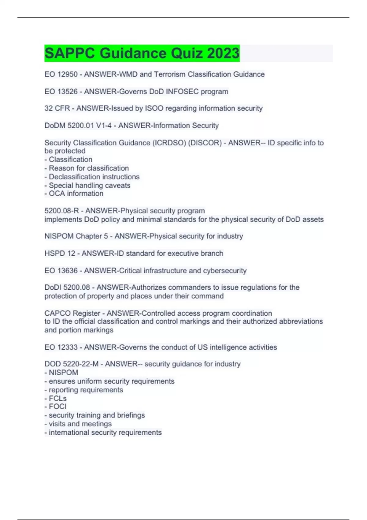 EO 12950 - ANSWER-WMD and Terrorism Classification Guidance EO 13526 - ANSWER-Governs DoD INFOSEC program 32 CFR - ANSWER-Issued by ISOO regarding information security DoDM 5200.01 V1-4 - ANSWER-Information Security Security Classification Guidance (ICRDSO) (DISCOR) - ANSWER-- ID specific info to be protected - Classification - Reason for classification - Declassification instructions - Special handling caveats - OCA information 5200.08-R - ANSWER-Physical security program implements DoD policy and minimal standards for the physical security of DoD assets NISPOM Chapter 5 - ANSWER-Physical security for industry HSPD 12 - ANSWER-ID standard for executive branch EO 13636 - ANSWER-Critical infrastructure and cybersecurity DoDI 5200.08 - ANSWER-Authorizes commanders to issue regulations for the protection of property and places under their command CAPCO Register - ANSWER-Controlled access program coordination to ID the official classification and control markings and their authorized abbreviations and portion markings EO 12333 - ANSWER-Governs the conduct of US intelligence activities DOD 5220-22-M - ANSWER-- security guidance for industry - NISPOM - ensures uniform security requirements - reporting requirements - FCLs - FOCI - security training and briefings - visits and meetings - international security requirements