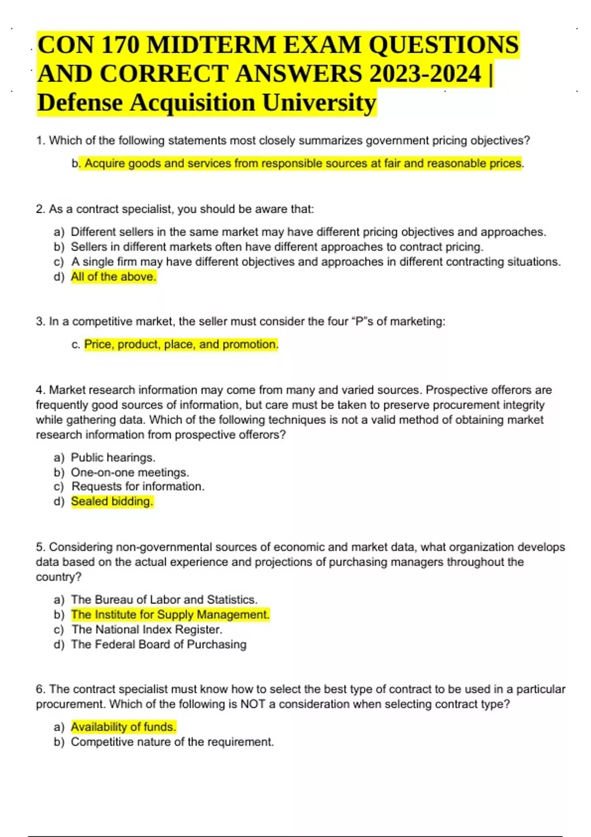 CON 170 MIDTERM EXAM QUESTIONS AND ANSWERS LATEST UPDATE | 100% Verified. As a contract specialist, you should be aware that: a) Different sellers in the same market may have different pricing objectives and approaches. b) Sellers in different markets often have different approaches to contract pricing. c) A single firm may have different objectives and approaches in different contracting situations. d) All of the above. 3. In a competitive market, the seller must consider the four “P”s of marketing: c. Price, product, place, and promotion. 4. Market research information may come from many and varied sources. Prospective offerors are frequently good sources of information, but care must be taken to preserve procurement integrity while gathering data. Which of the following techniques is not a valid method of obtaining market research information from prospective offerors? a) Public hearings. b) One-on-one meetings. c) Requests for information. d) Sealed bidding. 5. Considering non-governmental sources of economic and market data, what organization develops data based on the actual experience and projections of purchasing managers throughout the country? a) The Bureau of Labor and Statistics. b) The Institute for Supply Management. c) The National Index Register. d) The Federal Board of Purchasing 6. The contract specialist must know how to select the best type of contract to be used in a particular procurement. Which of the following is NOT a consideration when selecting contract type? a) Availability of funds. b) Competitive nature of the requirement. CON 170 MIDTERM EXAM QUESTIONS AND CORRECT ANSWERS | Defense Acquisition University c) Adequacy of the contractor’s accounting system. d) Type and complexity of the requirement. 7. What type of fixed- price contract involves a profit-sharing formula? a) Fixed-price award fee. 78.. b) Fixed-price incentive firm. c) Fixed-price prospective redetermination. d) Fixed-price economic price adjustment. 8. The fixed-price economic price adjustment contract helps to keep contract prices low yet fair to all parties over a generally longer time period. What risk is mitigated with this type of contract? a) Contractor performance risk. b) Fluctuations in market prices for certain materials or labor. c) Changes in federal and state tax rates. d) Unknown future funds availability. 9. Sometimes, a requirement emerges that can only be met with a cost reimbursement contract, and there may be very limited competition for that reason. What type of contract objectively varies the contractor’s fee from a minimum to a maximum fee amount based on the contractor’s cost control? 12a.. Cost plus award fee. 34b.. Cost plus fixed fee. 56c.. Cost sharing. d. Cost plus incentive fee.