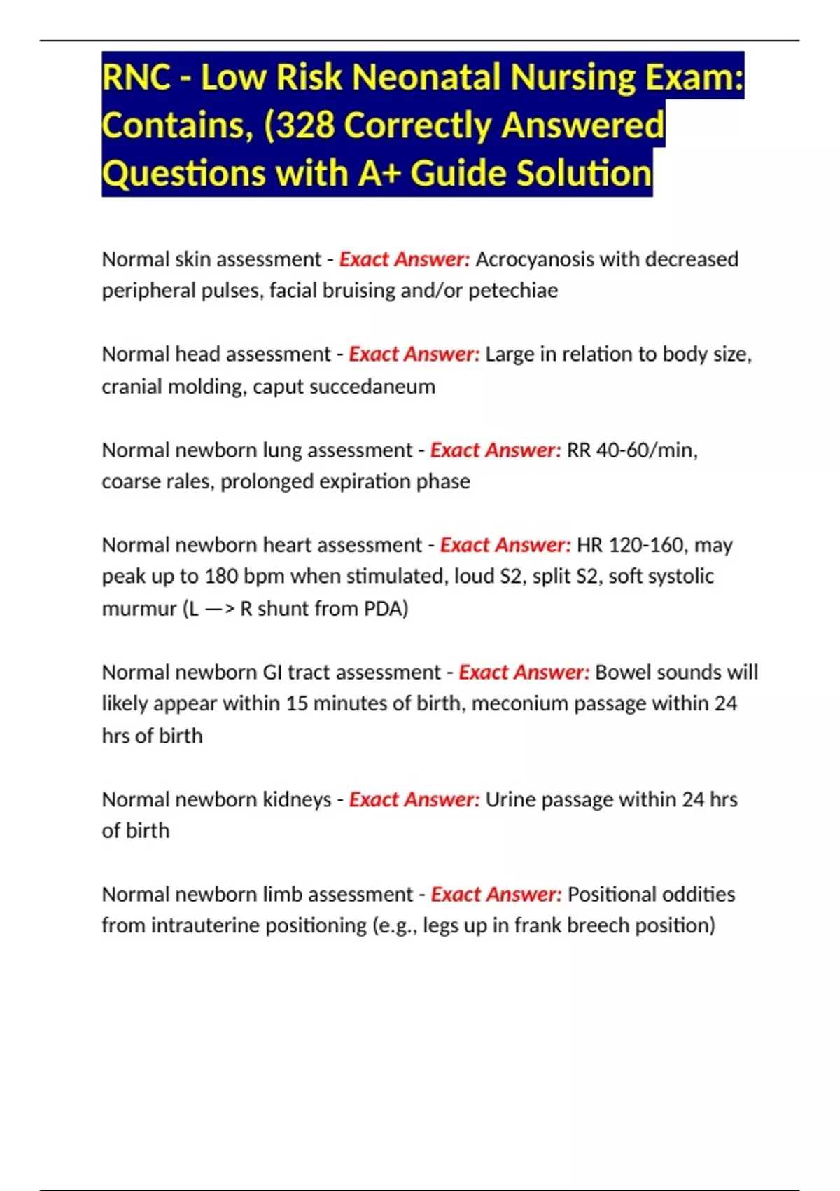 RNC - Low Risk Neonatal Nursing Exam: Contains, (328 Correctly Answered Questions with A+ Guide Solution