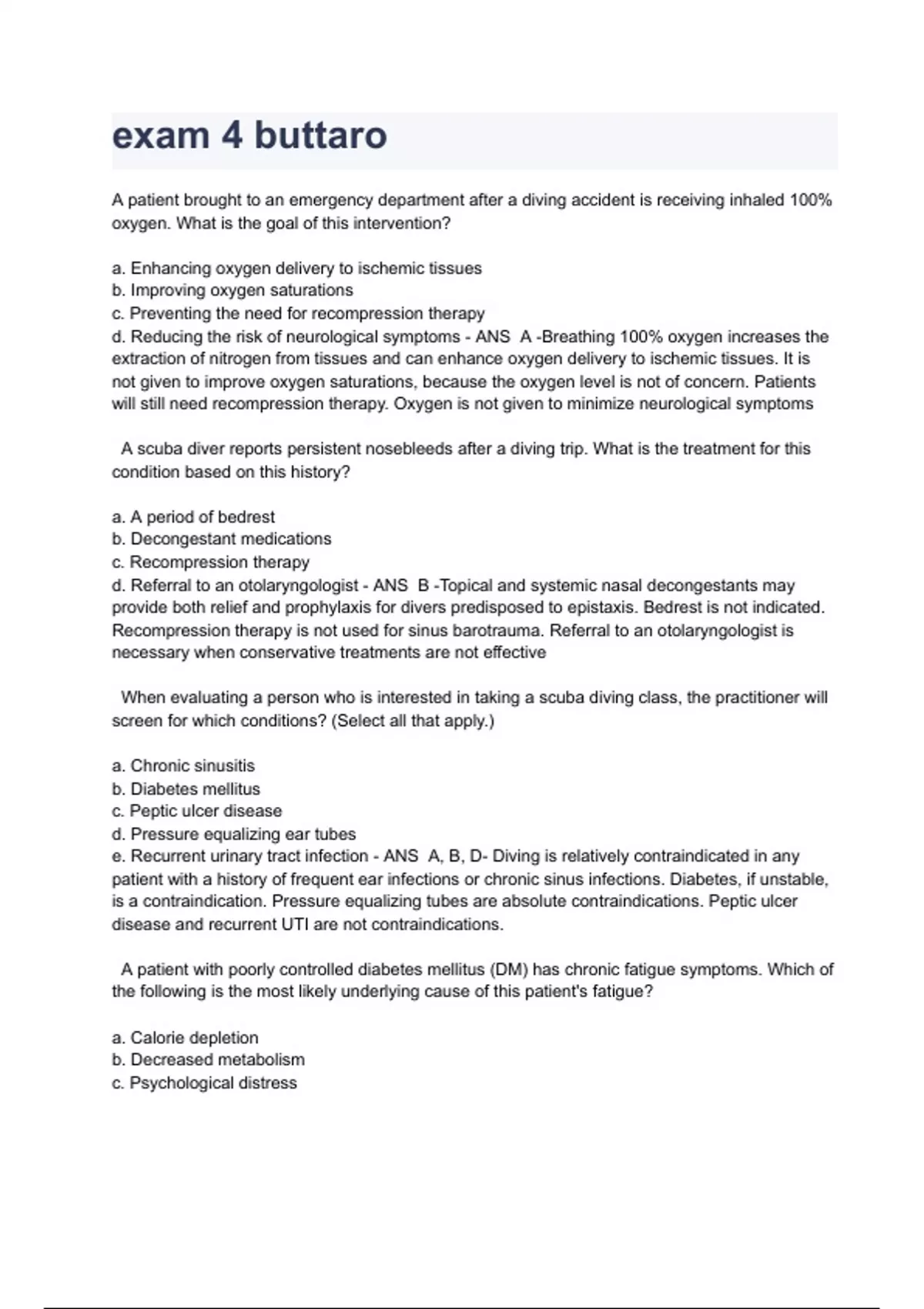 exam 4 buttaro A patient brought to an emergency department after a diving accident is receiving inhaled 100% oxygen. What is the goal of this intervention? a. Enhancing oxygen delivery to ischemic tissues b. Improving oxygen saturations c. Preventing the need for recompression therapy d. Reducing the risk of neurological symptoms - ANS A -Breathing 100% oxygen increases the extraction of nitrogen from tissues and can enhance oxygen delivery to ischemic tissues. It is not given to improve oxygen saturations, because the oxygen level is not of concern. Patients will still need recompression therapy. Oxygen is not given to minimize neurological symptoms A scuba diver reports persistent nosebleeds after a diving trip. What is the treatment for this condition based on this history? a. A period of bedrest b. Decongestant medications c. Recompression therapy d. Referral to an otolaryngologist - ANS B -Topical and systemic nasal decongestants may provide both relief and prophylaxis for divers predisposed to epistaxis. Bedrest is not indicated. Recompression therapy is not used for sinus barotrauma. Referral to an otolaryngologist is necessary when conservative treatments are not effective When evaluating a person who is interested in taking a scuba diving class, the practitioner will screen for which conditions? (Select all that apply.) a. Chronic sinusitis b. Diabetes mellitus c. Peptic ulcer disease d. Pressure equalizing ear tubes e. Recurrent urinary tract infection - ANS A, B, D- Diving is relatively contraindicated in any patient with a history of frequent ear infections or chronic sinus infections. Diabetes, if unstable, is a contraindication. Pressure equalizing tubes are absolute contraindications. Peptic ulcer disease and recurrent UTI are not contraindications. A patient with poorly controlled diabetes mellitus (DM) has chronic fatigue symptoms. Which of the following is the most likely underlying cause of this patient's fatigue? a. Calorie depletion b. Decreased metabolism c. Psychological distress d. Sleep apnea - ANS A-Patients with poorly controlled DM can have significant fluid and calorie depletion causing fatigue. Diabetes Fatigue Syndrome requires glycemic control, a healthy diet, regular exercise and sleep, plus careful monitoring. Patients with hypothyroidism have decreased metabolism leading to fatigue. Psychological distress causing fatigue is associated with malignant neoplasms of the blood. Sleep apnea causing fatigue is associated with morbid obesity A patient is seen in the clinic with reports of constant fatigue. The patient's spouse reports that the patient moves and kicks the legs frequently during sleep. What treatment will the provider anticipate once a diagnosis of the underlying cause is confirmed? a. An anti-oxidant diet b. Cognitive behavioral therapy c. Iron supplements d. Melatonin daily at bedtime - ANS C-This patient most likely has restless leg syndrome which may result from low ferritin levels and which is treated with iron supplements. Anti-oxidant diets and cognitive behavioral therapy are sometimes used to treat non-specific CFS. Melatonin has not been shown to be effective Which are causes of physiologic fatigue? (Select all that apply.) a. Acute and chronic illness b. Excessive alcohol use c. Irregular sleep habits d. Medication side effects e. Morbid obesity - ANS B, C, D -Physiologic causes are those resulting from external influences and include poor sleep hygiene, substance abuse, and medication effects. Physical causes are those where fatigue is secondary to diseases or conditions. A patient reports daily, recurrent fever associated with sweating, chills, and recent weight loss. What may this type of fever indicate? a. An underlying disease caused by animal bites b. Fever related to an immunocompromised state c. Possible exposure to tropical diseases d. Tuberculosis (TB) or lymphoma - ANS D -Hectic fever, or recurring fever associated with weight loss, sweating, and chills is concerning for tuberculosis or lymphoma. Fever from animal bites or travel to tropical areas is diagnosed after a history of exposure. A patient has a fever of unknown etiology and blood tests reveal elevated eosinophils. The patient has no history of asthma or allergies. What may be the cause of this fever? a. Animal bite b. Endocarditis c. Lymphoma d. Parasites - ANS D-Eosinophils classically suggest a parasitic infection, asthma, or allergy. They are not present with other conditions unless there is concurrent parasitic infection or underlying asthma or allergies.