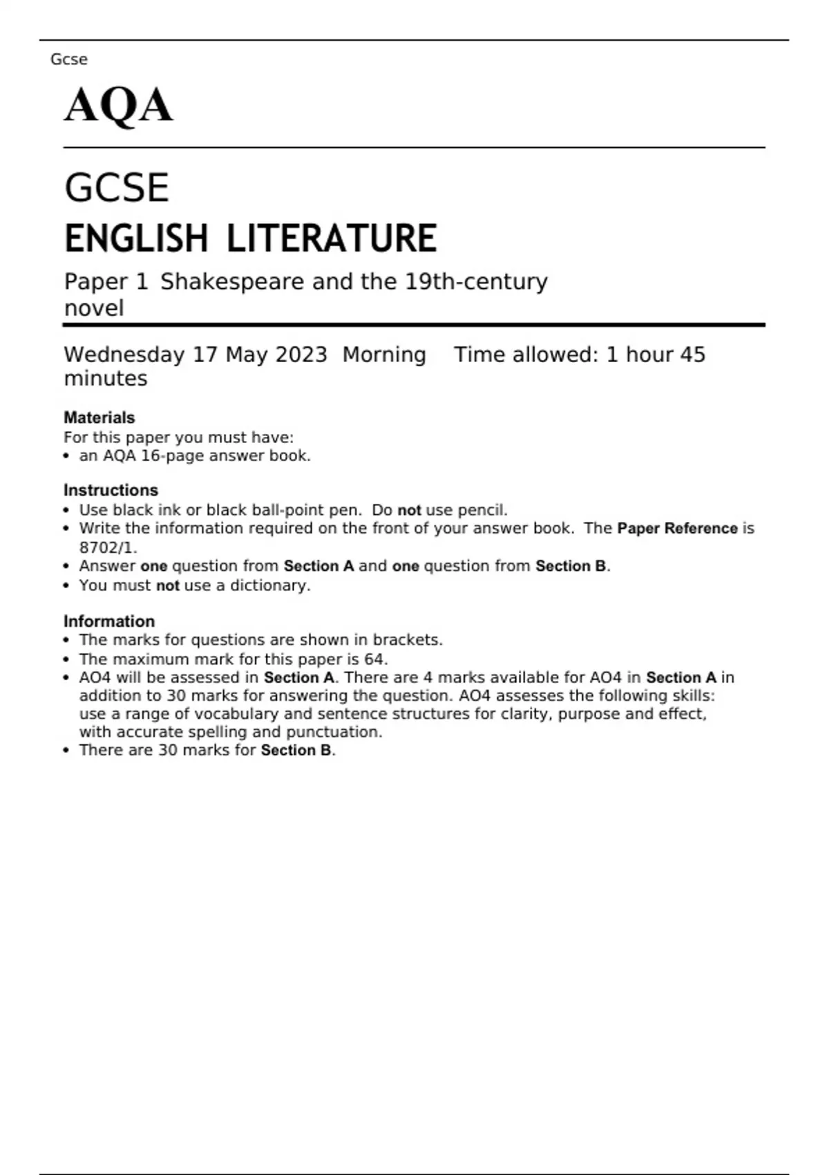 AQA GCSE ENGLISH LITERATURE Paper 1 JUNE 2023 QUESTION PAPER: Shakespeare and the 19th-century novel
