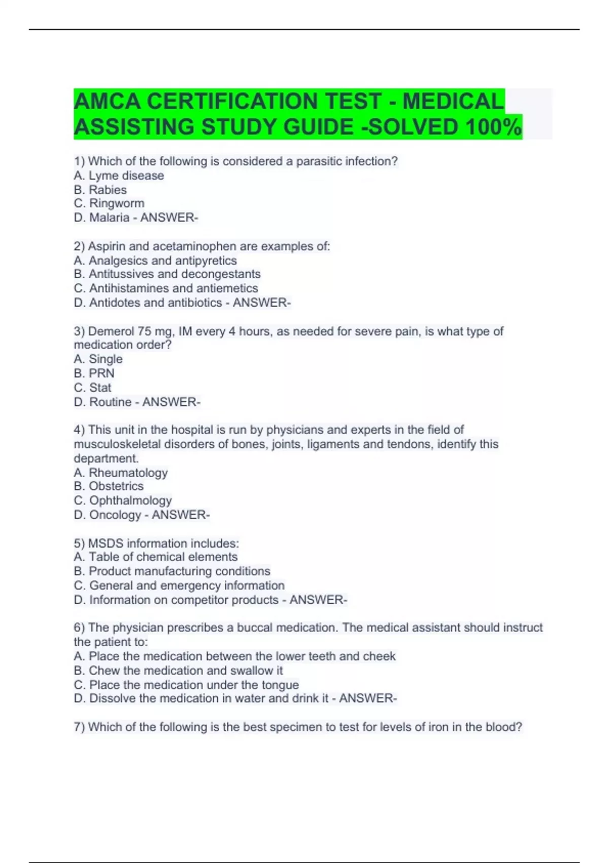 1) Which of the following is considered a parasitic infection? A. Lyme disease B. Rabies C. Ringworm D. Malaria - ANSWER- 2) Aspirin and acetaminophen are examples of: A. Analgesics and antipyretics B. Antitussives and decongestants C. Antihistamines and antiemetics D. Antidotes and antibiotics - ANSWER- 3) Demerol 75 mg, IM every 4 hours, as needed for severe pain, is what type of medication order? A. Single B. PRN C. Stat D. Routine - ANSWER- 4) This unit in the hospital is run by physicians and experts in the field of musculoskeletal disorders of bones, joints, ligaments and tendons, identify this department. A. Rheumatology B. Obstetrics C. Ophthalmology D. Oncology - ANSWER- 5) MSDS information includes: A. Table of chemical elements B. Product manufacturing conditions C. General and emergency information D. Information on competitor products - ANSWER- 6) The physician prescribes a buccal medication. The medical assistant should instruct the patient to: A. Place the medication between the lower teeth and cheek B. Chew the medication and swallow it C. Place the medication under the tongue D. Dissolve the medication in water and drink it - ANSWER- 7) Which of the following is the best specimen to test for levels of iron in the blood? A. The one collected in a tube that contains sodium citrate B. The one collected in a microcuvette C. The one collected in the tube that contains EDTA D. The one collected in a tube with no additive - ANSWER- 8) All pathogens are: A. Microorganisms that live in soil B. Microbes that can cause disease C. Communicable microorganisms D. Normal bacteria found on skin - ANSWER- 9) Every prescription for a controlled substance requires the physicians signature and a ____________ number? A. FDA B. DEA C.EPA D.CDC - ANSWER- 10) When using a No. 10 envelope, where should the address be placed? A. 10 lines down from the top and 4 inches from the left edge of the envelope B. 14 lines down from the top and 2 inches from the left edge of the envelope C. 10 lines down from the top and 2 inches from the left edge of the envelope D. 14 lines down from the top and 4 inches from the left edge of the envelope - ANSWER- 11) What drug prevents the action of another drug or chemical? A. Trade B. Narcotic C. Synergist D. Antagonist - ANSWER- 12) Co-insurance is calculated based on a: A. A capitation rate B. Percentage of charge C. A fixed charge for each visit D. Number of policy holders in the plan - ANSWER- 13) Muscles that act on the knee joint exhibit two actions: A. Adduction and lateral rotation B. Medical rotation and extension C. Adduction and Abduction D. Flexion and extension - ANSWER- 14) A structure that is composed of two or more tissue types is called a/an: A. System B. Organism