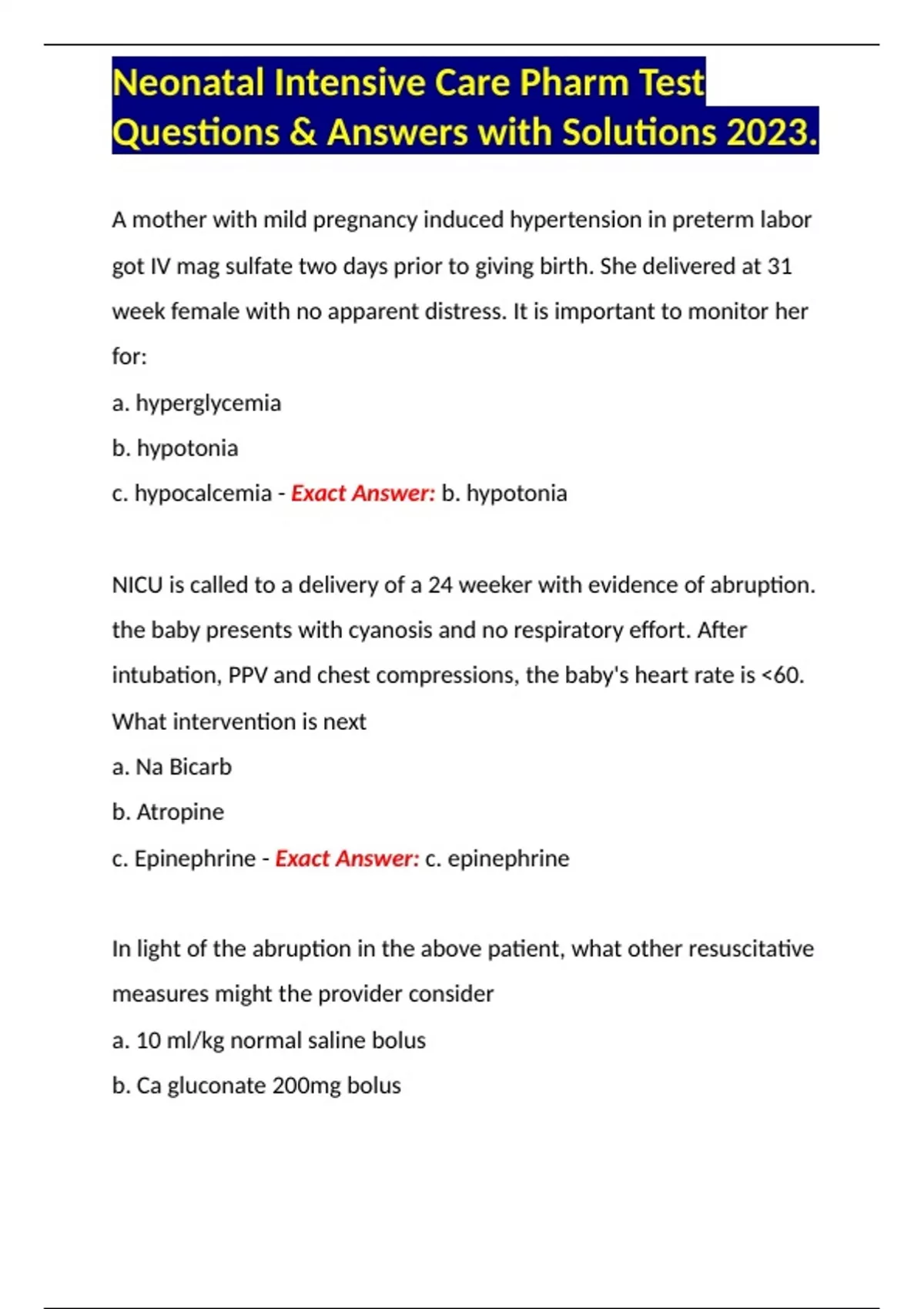 Neonatal Intensive Care Pharm Test Questions & Answers with Solutions 2023.