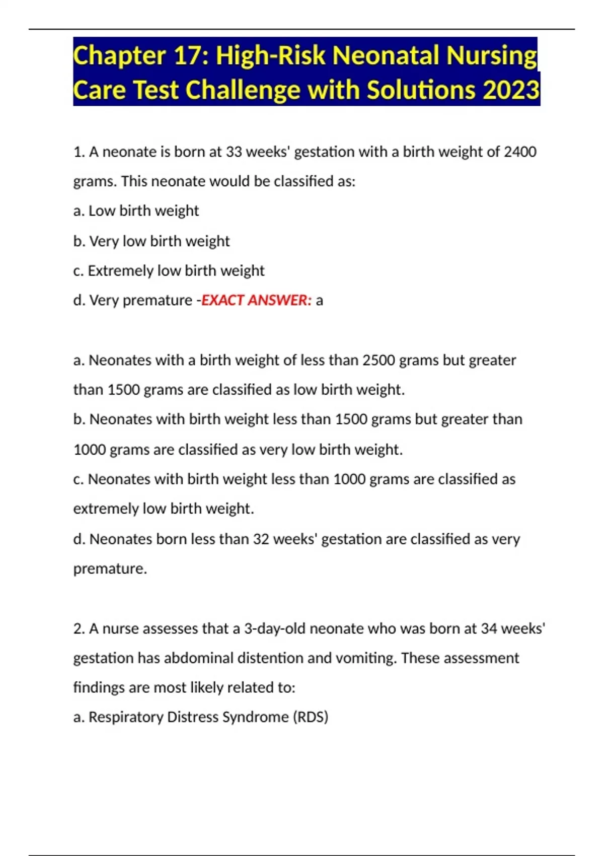 Chapter 17: High-Risk Neonatal Nursing Care Test Challenge with Solutions 2023