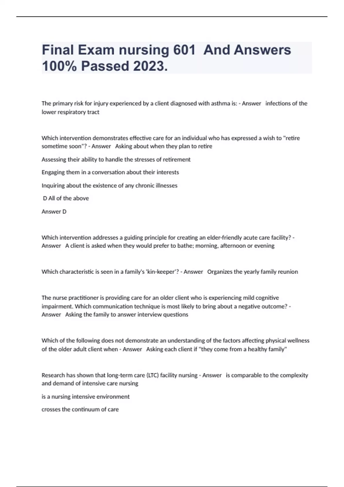 The primary risk for injury experienced by a client diagnosed with asthma is: - Answer infections of the lower respiratory tract Which intervention demonstrates effective care for an individual who has expressed a wish to "retire sometime soon"? - Answer Asking about when they plan to retire Assessing their ability to handle the stresses of retirement Engaging them in a conversation about their interests Inquiring about the existence of any chronic illnesses D All of the above Answer D Which intervention addresses a guiding principle for creating an elder-friendly acute care facility? - Answer A client is asked when they would prefer to bathe; morning, afternoon or evening Which characteristic is seen in a family's 'kin-keeper'? - Answer Organizes the yearly family reunion The nurse practitioner is providing care for an older client who is experiencing mild cognitive impairment. Which communication technique is most likely to bring about a negative outcome? - Answer Asking the family to answer interview questions Which of the following does not demonstrate an understanding of the factors affecting physical wellness of the older adult client when - Answer Asking each client if "they come from a healthy family" Research has shown that long-term care (LTC) facility nursing - Answer is comparable to the complexity and demand of intensive care nursing is a nursing intensive environment crosses the continuum of care