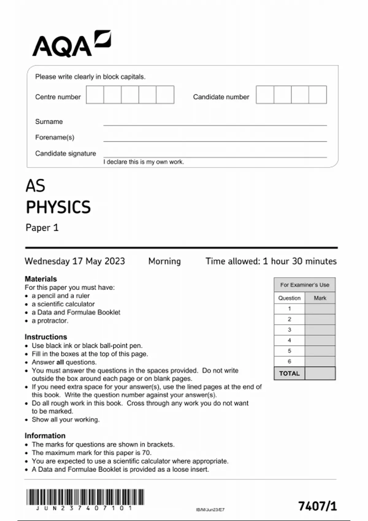 - AQA AS PHYSICS PAPER 1 MAY 2023 7407-1