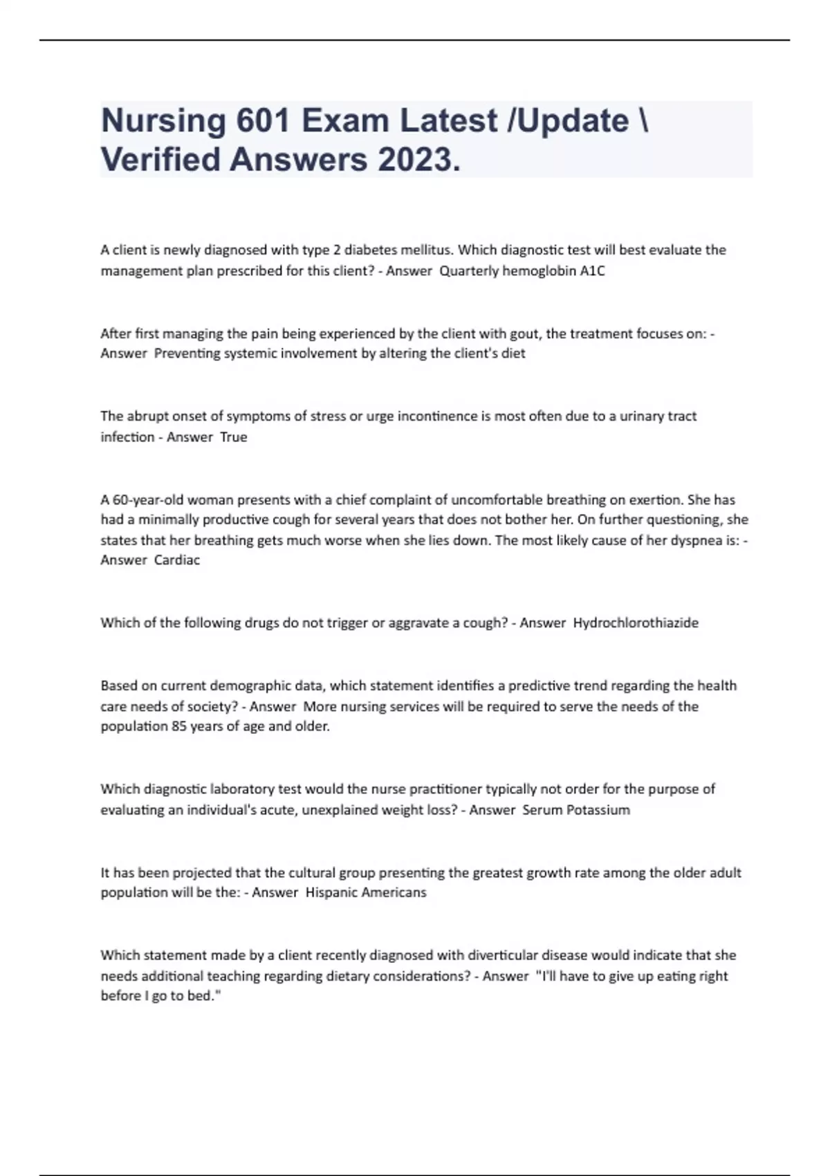 A client is newly diagnosed with type 2 diabetes mellitus. Which diagnostic test will best evaluate the management plan prescribed for this client? - Answer Quarterly hemoglobin A1C After first managing the pain being experienced by the client with gout, the treatment focuses on: - Answer Preventing systemic involvement by altering the client's diet The abrupt onset of symptoms of stress or urge incontinence is most often due to a urinary tract infection - Answer True A 60-year-old woman presents with a chief complaint of uncomfortable breathing on exertion. She has had a minimally productive cough for several years that does not bother her. On further questioning, she states that her breathing gets much worse when she lies down. The most likely cause of her dyspnea is: - Answer Cardiac Which of the following drugs do not trigger or aggravate a cough? - Answer Hydrochlorothiazide Based on current demographic data, which statement identifies a predictive trend regarding the health care needs of society? - Answer More nursing services will be required to serve the needs of the population 85 years of age and older. Which diagnostic laboratory test would the nurse practitioner typically not order for the purpose of evaluating an individual's acute, unexplained weight loss? - Answer Serum Potassium It has been projected that the cultural group presenting the greatest growth rate among the older adult population will be the: - Answer Hispanic Americans Which statement made by a client recently diagnosed with diverticular disease would indicate that she needs additional teaching regarding dietary considerations? - Answer "I'll have to give up eating right before I go to bed."