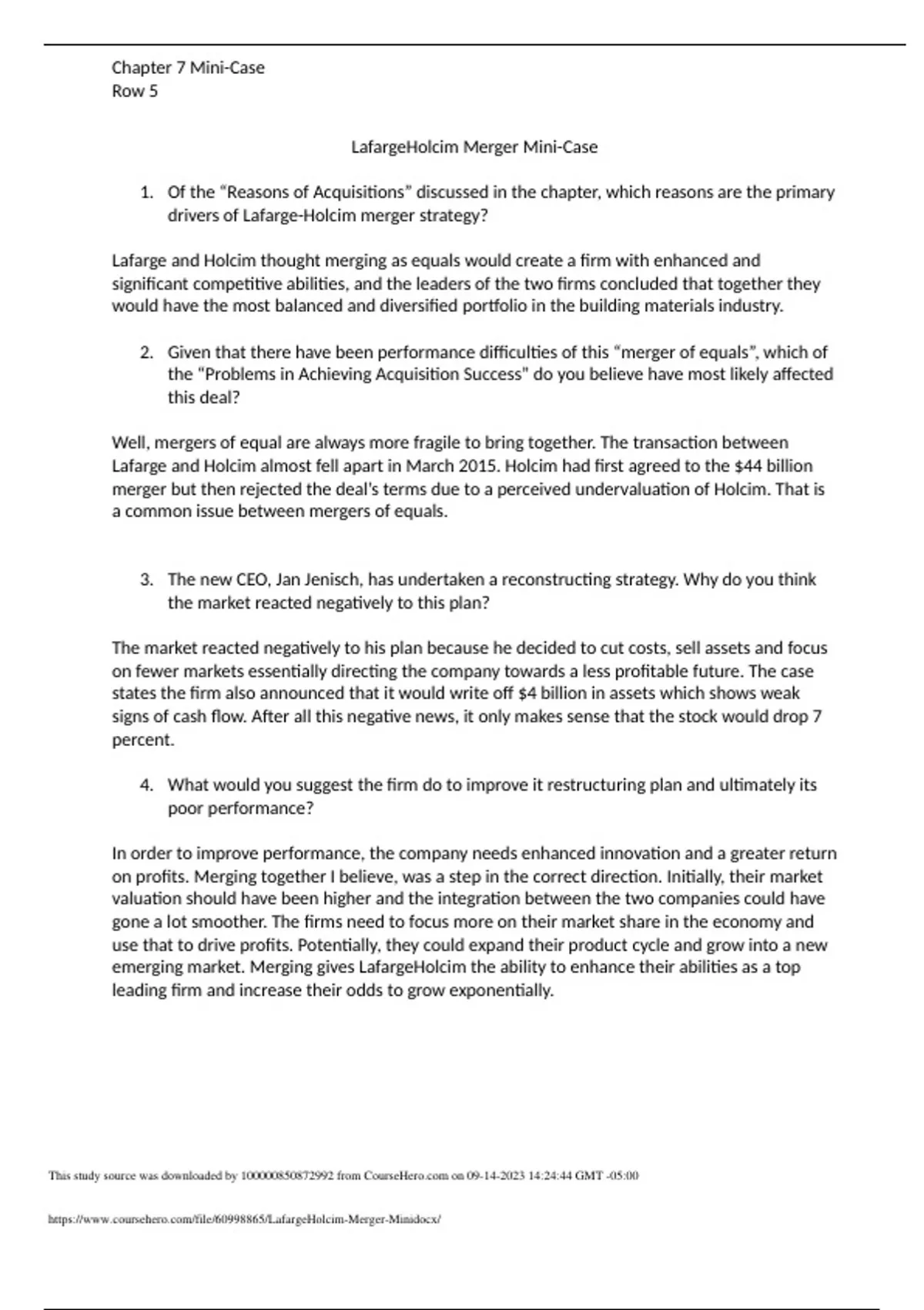 MGT 487 LafargeHolcim Merger Mini QUESTIONS WITH ANSWERS (ALL CORRECT) LafargeHolcim Merger Mini-Case 1. Of the “Reasons of Acquisitions” discussed in the chapter, which reasons are the primary drivers of Lafarge-Holcim merger strategy? Lafarge and Holcim thought merging as equals would create a firm with enhanced and significant competitive abilities, and the leaders of the two firms concluded that together they would have the most balanced and diversified portfolio in the building materials industry. 2. Given that there have been performance difficulties of this “merger of equals”, which of the “Problems in Achieving Acquisition Success” do you believe have most likely affected this deal? Well, mergers of equal are always more fragile to bring together. The transaction between Lafarge and Holcim almost fell apart in March 2015. Holcim had first agreed to the $44 billion merger but then rejected the deal’s terms due to a perceived undervaluation of Holcim. That is a common issue between mergers of equals. 3. The new CEO, Jan Jenisch, has undertaken a reconstructing strategy. Why do you think the market reacted negatively to this plan? The market reacted negatively to his plan because he decided to cut costs, sell assets and focus on fewer markets essentially directing the company towards a less profitable future. The case states the firm also announced that it would write off $4 billion in assets which shows weak signs of cash flow. After all this negative news, it only makes sense that the stock would drop 7 percent. 4. What would you suggest the firm do to improve it
