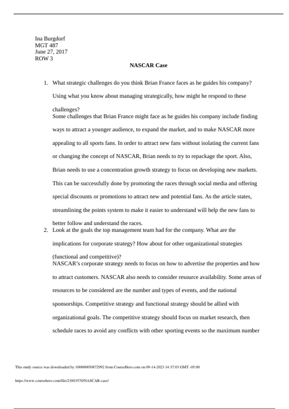 NASCAR Case 1. What strategic challenges do you think Brian France faces as he guides his company? Using what you know about managing strategically, how might he respond to these challenges? Some challenges that Brian France might face as he guides his company include finding ways to attract a younger audience, to expand the market, and to make NASCAR more appealing to all sports fans. In order to attract new fans without isolating the current fans or changing the concept of NASCAR, Brian needs to try to repackage the sport. Also, Brian needs to use a concentration growth strategy to focus on developing new markets. This can be successfully done by promoting the races through social media and offering special discounts or promotions to attract new