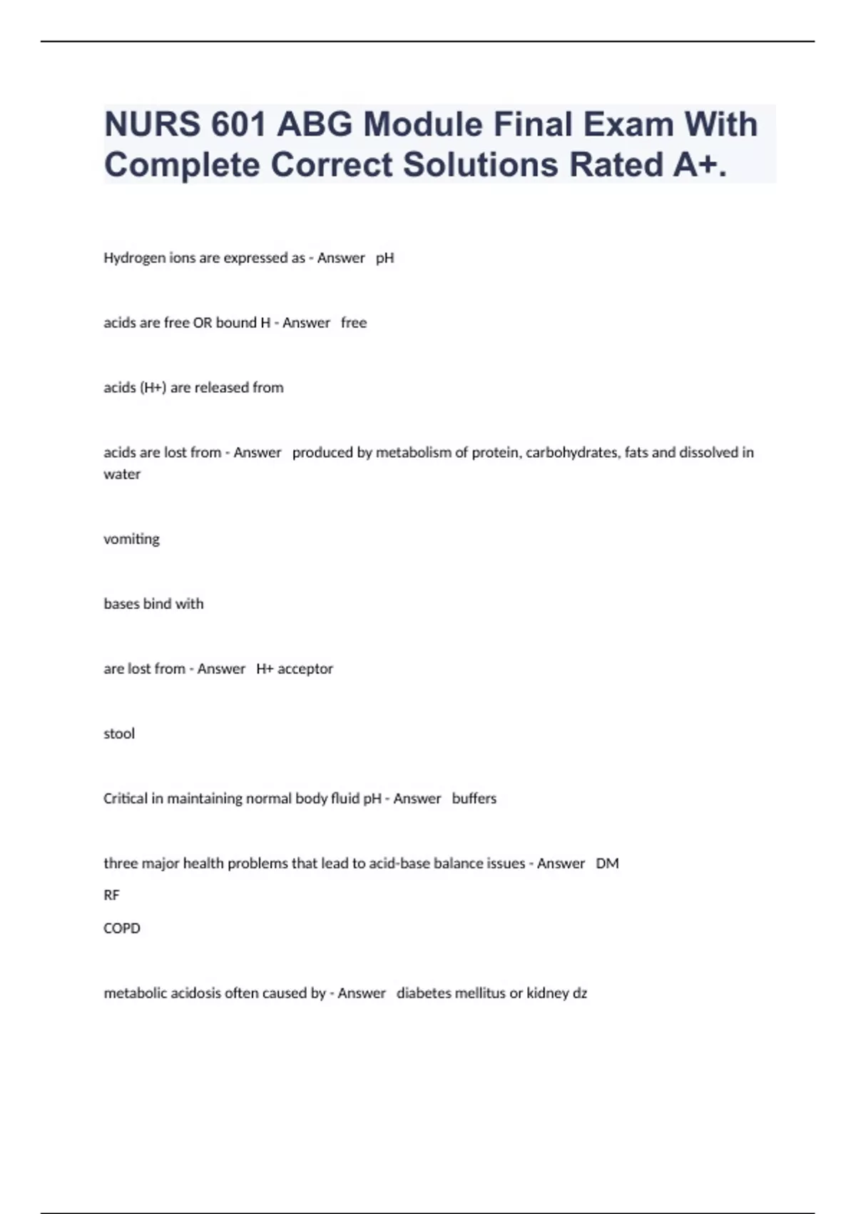 NURS 601 ABG Module Final Exam With Complete Correct Solutions Rated A+.