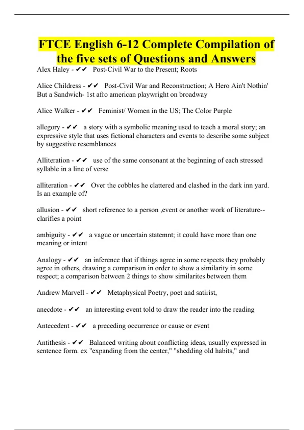 FTCE English 6-12 Complete Compilation of the five sets of Questions and Answers