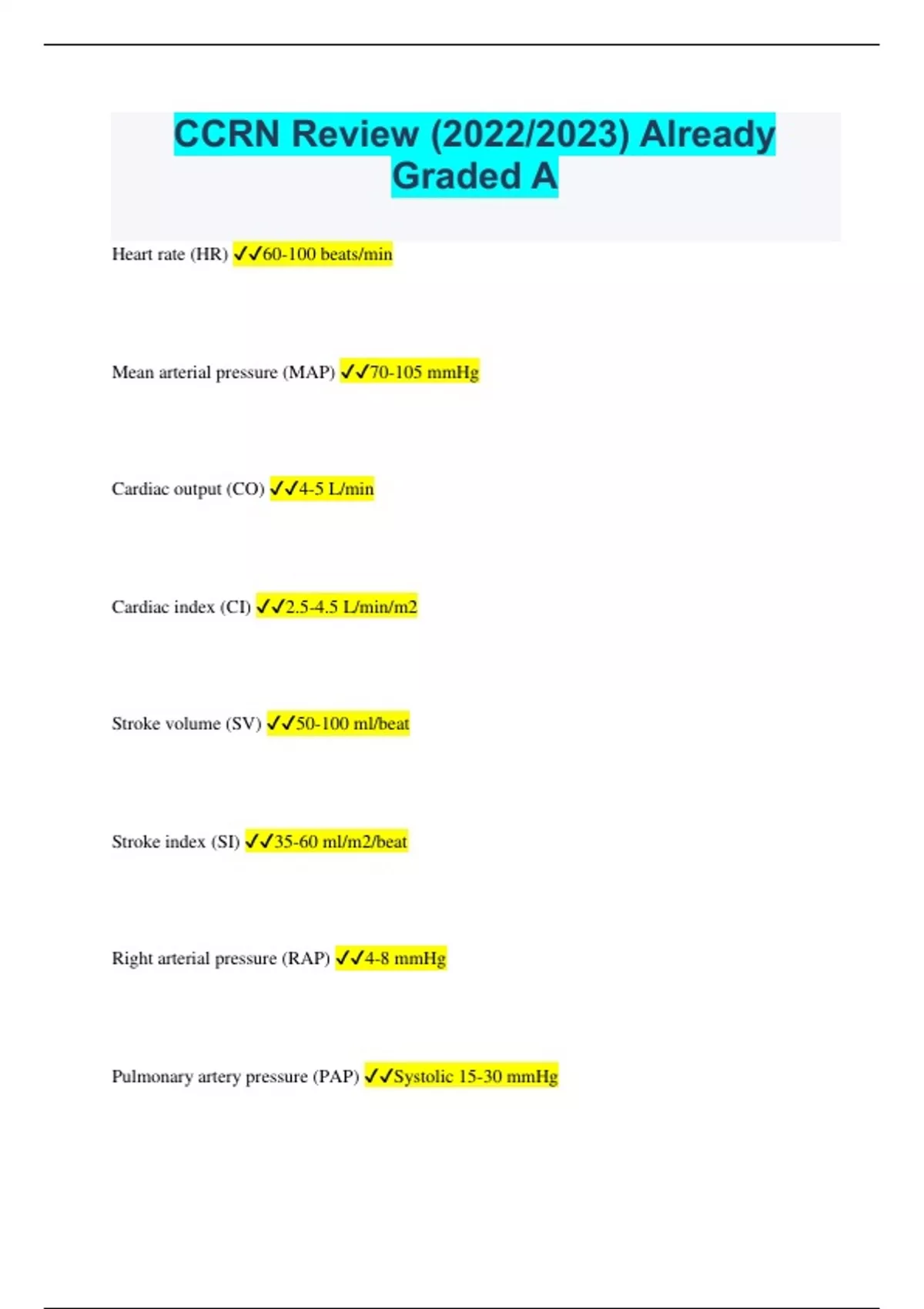 CCRN Review (2022/2023) Already Graded A Heart rate (HR) 60-100 beats/min Mean arterial pressure (MAP) 70-105 mmHg Cardiac output (CO) 4-5 L/min Cardiac index (CI) 2.5-4.5 L/min/m2 Stroke volume (SV) 50-100 ml/beat Stroke index (SI) 35-60 ml/m2/beat Right arterial pressure (RAP) 4-8 mmHg Pulmonary artery pressure (PAP) Systolic 15-30 mmHg Diastolic 5-15 mmHg Pulmonary artery occlusive pressure (PAOP) 8-12 mmHg Systemic vascular resistance (SVR) 800-1200 dynes/sec/cm-5 Systemic vascular resistance index (SVRI) dynes/se/com-5/m2 Pulmonary vascular resistance (PVR) 100-250 dynes/sec/cm-5 Pulmonary vascular resistance index (PVRI) 255-285 dyens/sec/cim-5/m2 Arterial oxygen saturation (SaO2) 95-100% Venous oxygen saturation (SvO2) 60-80% Delivery of oxygen (DO2) 550-650 ml/min/m2 Oxygen consumption (VO2) 200-250 ml/min Inferior leads and artery - cardiac Lead II, III, aVF - RCA Anterior septal leads and artery - cardiac Lead V1, V2 - LM Anterior leads and artery - cardiac Lead V3, V4 - LAD Low lateral lead and artery - cardiac Lead V5, V6 - LCX High lateral