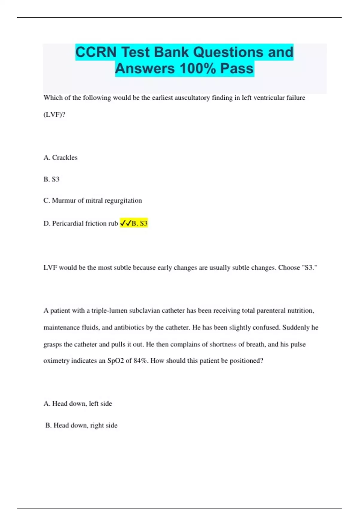 CCRN Test Bank Questions and Answers 100% Pass Which of the following would be the earliest auscultatory finding in left ventricular failure (LVF)? A. Crackles B. S3 C. Murmur of mitral regurgitation D. Pericardial friction rub B. S3 LVF would be the most subtle because early changes are usually subtle changes. Choose "S3." A patient with a triple-lumen subclavian catheter has been receiving total parenteral nutrition, maintenance fluids, and antibiotics by the catheter. He has been slightly confused. Suddenly he grasps the catheter and pulls it out. He then complains of shortness of breath, and his pulse oximetry indicates an SpO2 of 84%. How should this patient be positioned? A. Head down, left side B. Head down, right side C. Head of bed elevated, left side D. Head of bed elevated, right side A. Head down, left side Envision a big air bubble in the patient's heart. Think: what position would decrease the movement of the air embolism out of the right side of the heart. Chose "Head down, left side." Oxygen delivery (DO2) is the product of which of the following? A. PaO2, hemoglobin, mean arterial pressure B. SaO2, hemoglobin, cardiac output C. SvO2, cardiac index, SaO2 D. PaO2, mean arterial pressure, SvO2 B. SaO2, hemoglobin, cardiac output Oxygen is delivered from the arterial end, so choose an option that has SaO2 Which of the following is the most significant complication of status asthmaticus? A. Pulmonary embolism B. Acute respiratory failure C. Hypertension D. Anaphylaxis B. Acute respiratory failure A 22-year-old man is admitted to the critical care unit after a motor vehicle collision. The emergency department nurse reports that he was unconscious at the scene of the accident, but he is now alert and oriented. Skull films show a linear fracture of the right temporal bone. He is at significant risk for: A.