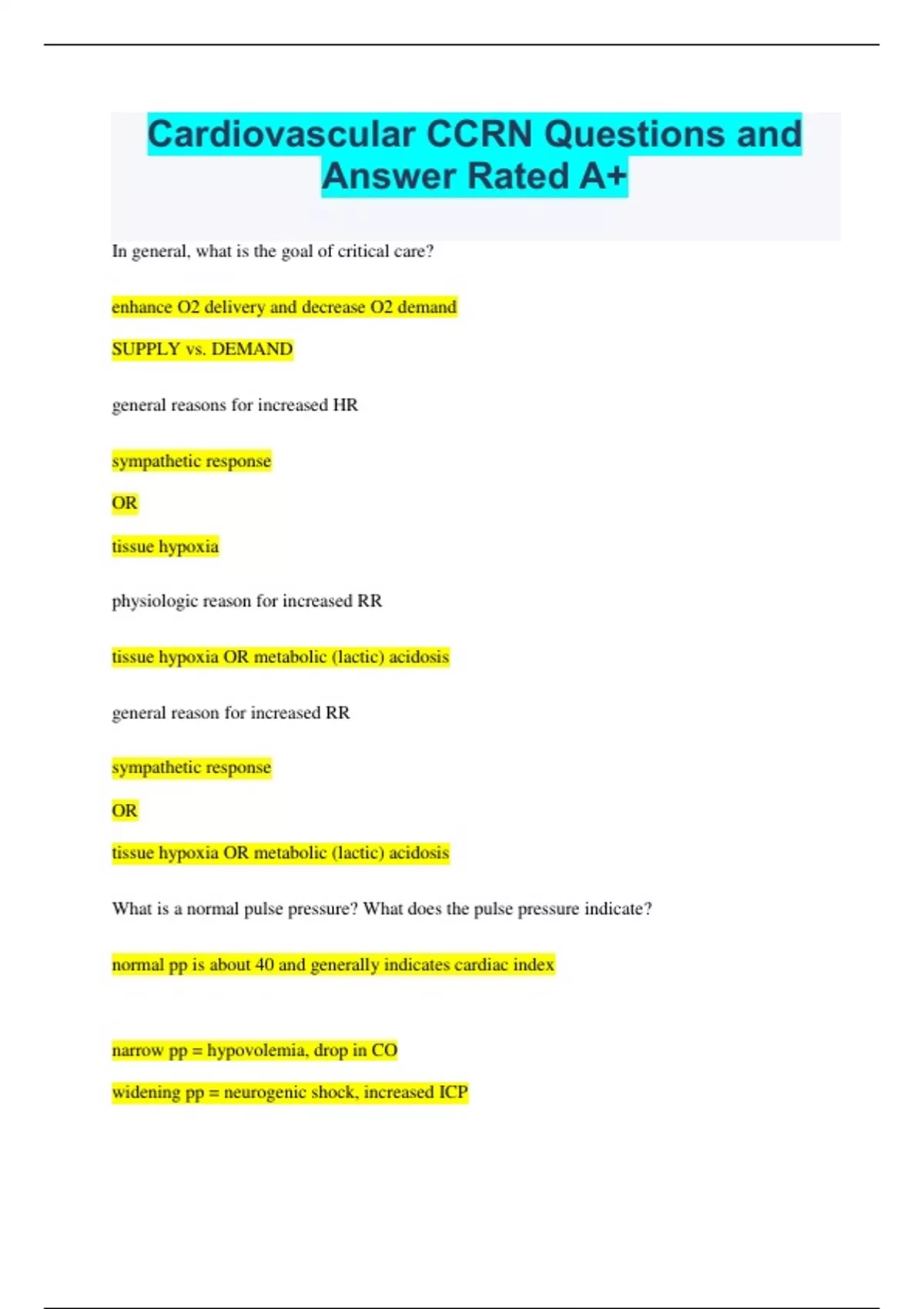 Cardiovascular CCRN Questions and Answer Rated A+ In general, what is the goal of critical care? enhance O2 delivery and decrease O2 demand SUPPLY vs. DEMAND general reasons for increased HR sympathetic response OR tissue hypoxia physiologic reason for increased RR tissue hypoxia OR metabolic (lactic) acidosis general reason for increased RR sympathetic response OR tissue hypoxia OR metabolic (lactic) acidosis What is a normal pulse pressure? What does the pulse pressure indicate? normal pp is about 40 and generally indicates cardiac index narrow pp = hypovolemia, drop in CO widening pp = neurogenic shock, increased ICP How to tell generally which type of shock you are looking at based on vital signs? * hypovolemic, cardiogenic - narrowed PP, increased HR (check the H&P, echo - does this person have a condition which would indicate potential for cardiogenic shock?) * neurogenic - widened PP, decreased HR * anaphylactic, septic - BP down, HR up Normal Hemodynamic and Oxygenation Parameters coronary arteries RCA, LCA > LCfx, LAD What structures are supplied by the RCA? right atrium, right ventricle, posterior left ventricle (left ventricular inferior wall), SA node, AV node, top of septum with bundle What types of dysrythmias are expected in an inferior wall MI? In a 12-lead EKG, which leads are identified? leads II, III, aVf (what structures are supplied by the RCA, which feeds the left ventricular inferior wall?) bradycardias and heart block > why? because RCA supplies this area Associated with AV conduction disturbances: 2nd-degree Type I, 3rd-degree heart block, sick sinus syndrome (SSS), and sinus bradycardia Development of systolic murmur: mitral valve regurgitation (MVR) secondary to papillary muscle rupture (Posterior papillary muscle-tethering distance is significantly greater in inferior compared with anterior myocardial infarction.) Tachycardia associated with inferior MI → higher mortality Also associated with RV infarct and posterior MI Use beta blockers and NTG with CAUTION *** What are important considerations in RV infarct? A right-sided ECG may demonstrate the ST changes. Treatment -