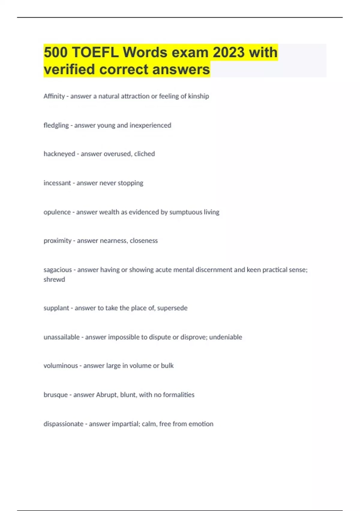 Affinity a natural attraction or feeling of kinship fledgling young and inexperienced hackneyed overused, cliched incessant never stopping opulence wealth as evidenced by sumptuous living proximity nearness, closeness sagacious having or showing acute mental discernment and keen practical sense; shrewd supplant to take the place of, supersede unassailable impossible to dispute or disprove; undeniable voluminous large in volume or bulk brusque Abrupt, blunt, with no formalities dispassionate impartial; calm, free from emotion effervescent bubbly, lively indefatigable tireless; untiring; showing no sign of getting tired misanthrope someone who dislikes people in general morose Gloomy; sullen nonchalance indifference, a showing of little interest progeny descendants, offspring, children, followers, disciples stoic seeming unaffected by pleasure or pain voracious having a huge appetite, greedy, ravenous; excessively eager coalesce combine; fuse decadence decline, decay, or deterioration; a condition or period of decline or decay; excessive self-indulgence exemplary outstanding, an example to others exuberance joyful enthusiasm incidental not essential; minor insolvent unable to pay bills; bankrupt parsimonious Excessively thrifty, stingy prodigal wasteful, a person given to extravagance surreptitious secret, stealthy writhe twist in coils; contort in pain brevity conciseness; shortness of duration clemency mercy, humaneness; mildness, moderateness frivolous not serious in content or attitude or behavior heist commit a burglary lampoon ridicule with satire querulous inclined to complain; irritable reproach a mild rebuke or criticism respite a pause for relaxation torpor dormancy; sluggishness; inactivity; drowziness unscathed wholly unharmed, not injured copious large in number or quantity (especially of discourse) dearth a lack, scarcity, inadequate supply; a famine eloquent persuasive and moving, especially in speech jargon specialized technical terminology characteristic of a particular subject levity lightness of manner meander To wind and turn while proceeding in a course. peripheral marginal; outer substantiate to establish by evidence, prove; to give concrete or substantial form to unobstrusive Acting in a manner that does not attract attention vacillate To sway from one side to the other; oscillate appall dismay; shock deeply cognizant aware; conscious commiserate to feel or express sympathy or compassion expedient serving to promote your interest hindrance block; obstacle kindle start a fire; ignite; inspire; arouse lavish generous; extravagant ludicrous ridiculous, laughable, absurd obtuse dull of mind, insensitive, stupid opaque not clear paucity an insufficient quantity or number; scarcity; dearth recapitulate to summarize; to repeat briefly accolade award of merit; strong praise and approval assuage make less severe; ease or lessen (pain); satisfy (hunger); soothe (anger) cacophony loud confusing disagreeable sounds censure rebuke formally