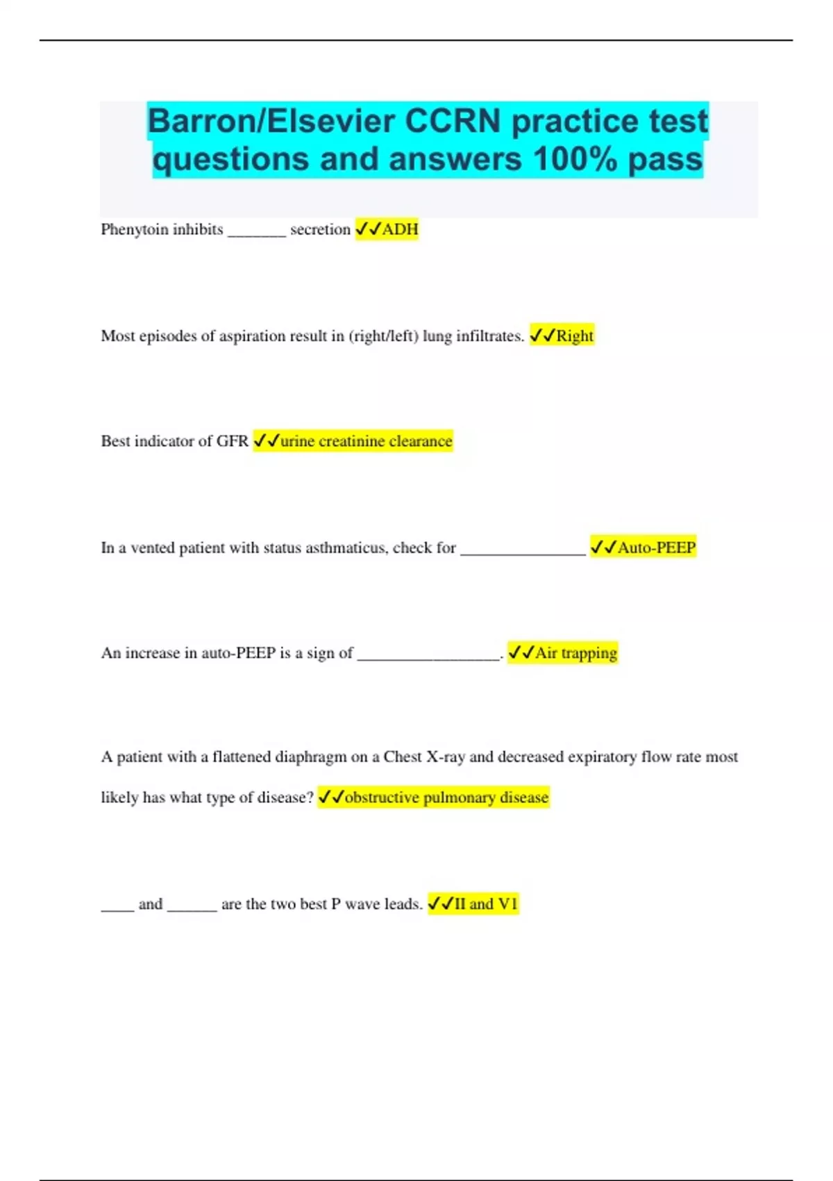 Barron/Elsevier CCRN practice test questions and answers 100% pass Phenytoin inhibits _______ secretion ADH Most episodes of aspiration result in (right/left) lung infiltrates. Right Best indicator of GFR urine creatinine clearance In a vented patient with status asthmaticus, check for _______________ Auto-PEEP An increase in auto-PEEP is a sign of _________________. Air trapping A patient with a flattened diaphragm on a Chest X-ray and decreased expiratory flow rate most likely has what type of disease? obstructive pulmonary disease ____ and ______ are the two best P wave leads. II and V1 What is a manifestation of left atrial enlargement on an EKG in lead II? wide, notched P waves Diphasic P waves in lead V1 on 12-lead EKG are abnormal/normal. normal _________ is the earliest cardiac biomarker for a MI (elevated within 3hrs s/p MI) and is nonspecific. myoglobin injection of a sclerosing agent into the pleural space and is used for pleural effusion pleurodesis The__________ coronary artery supplies the bundle of His and bundle branches LAD _____________ MIs may cause blocks of the bundle of His or bundle branches anterior (LAD affected) Type I AV block, also called Wenckebach, is a block at the AV node, and the AV node is supplied by the ___________________ (in 90% of people) Right Coronary Artery (RCA)... LCA in 10% of ppl the ____________ node is supplied by the RCA in 55% of ppl and LCA in 45% sinus The skin changes associated with chronic peripheral arterial disease pale and shiny what are the 6 Ps of acute arterial occlusion? pain, pallor, pulselessness, paresthesia, paralysis, and polar (cold) There