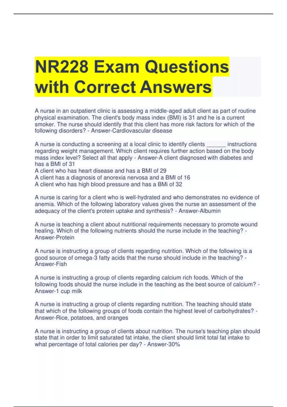 NR228 Exam Questions with Correct Answers A nurse in an outpatient clinic is assessing a middle-aged adult client as part of routine physical examination. The client's body mass index (BMI) is 31 and he is a current smoker. The nurse should identify that this client has more risk factors for which of the following disorders? - Answer-Cardiovascular disease A nurse is conducting a screening at a local clinic to identify clients ______ instructions regarding weight management. Which client requires further action based on the body mass index level? Select all that apply - Answer-A client diagnosed with diabetes and has a BMI of 31 A client who has heart disease and has a BMI of 29 A client has a diagnosis of anorexia nervosa and a BMI of 16 A client who has high blood pressure and has a BMi of 32 A nurse is caring for a client who is well-hydrated and who demonstrates no evidence of anemia. Which of the following laboratory values gives the nurse an assessment of the adequacy of the client's protein uptake and synthesis? - Answer-Albumin A nurse is teaching a client about nutritional requirements necessary to promote wound healing. Which of the following nutrients should the nurse include in the teaching? - Answer-Protein A nurse is instructing a group of clients regarding nutrition. Which of the following is a good source of omega-3 fatty acids that the nurse should include in the teaching? - Answer-Fish A nurse is instructing a group of clients regarding calcium rich foods. Which of the following foods should the nurse include in the teaching as the best source of calcium? - Answer-1 cup milk A nurse is instructing a group of clients regarding nutrition. The teaching should state that which of the following groups of foods contain the highest level of carbohydrates? - Answer-Rice, potatoes, and oranges A nurse is instructing a group of clients about nutrition. The nurse's teaching plan should state that in order to limit saturated fat intake, the client should limit total fat intake to what percentage of total calories per day? - Answer-30% A nurse is instructing a group of clients about nutrition. The nurse should include that which of the following foods is a good source of high-quality protein? - Answer-Soybeans A nurse is instructing a group of clients about nutrition. The nurse should include that which of the following is a trigger for the formation of vitamin D in the body? - Answer-Exposure to sunlight A nurse is instructing a group of adult clients about nutrition. The nurse should include which of the following as a recommend amount of vegetables servings per day? - Answer-2 1/2 cups
