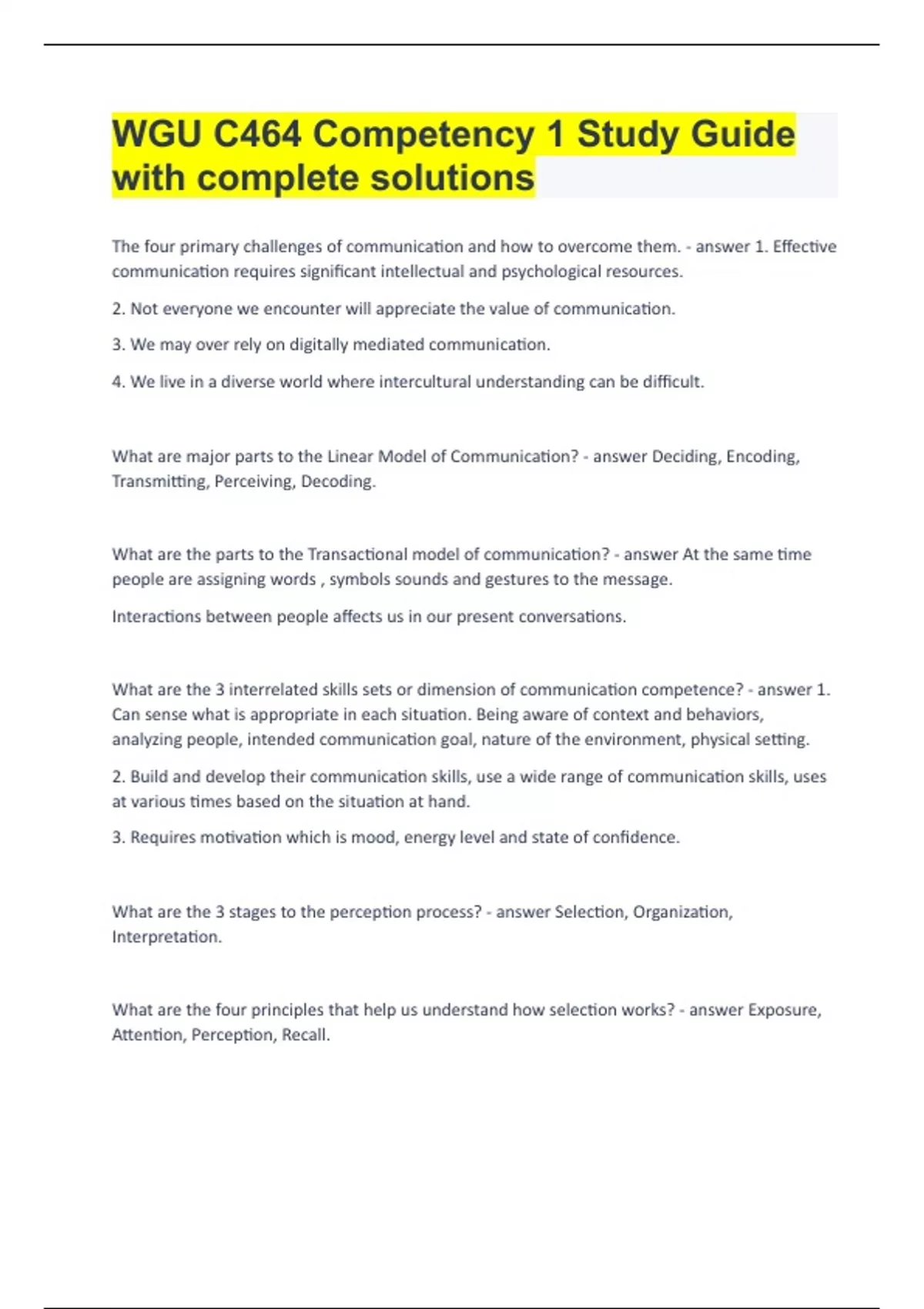 The four primary challenges of communication and how to overcome them. 1. Effective communication requires significant intellectual and psychological resources. 2. Not everyone we encounter will appreciate the value of communication. 3. We may over rely on digitally mediated communication. 4. We live in a diverse world where intercultural understanding can be difficult. What are major parts to the Linear Model of Communication? Deciding, Encoding, Transmitting, Perceiving, Decoding. What are the parts to the Transactional model of communication? At the same time people are assigning words , symbols sounds and gestures to the message. Interactions between people affects us in our present conversations. What are the 3 interrelated skills sets or dimension of communication competence? 1. Can sense what is appropriate in each situation. Being aware of context and behaviors, analyzing people, intended communication goal, nature of the environment, physical setting. 2. Build and develop their communication skills, use a wide range of communication skills, uses at various times based on the situation at hand. 3. Requires motivation which is mood, energy level and state of confidence. What are the 3 stages to the perception process? Selection, Organization, Interpretation. What are the four principles that help us understand how selection works? Exposure, Attention, Perception, Recall. What are 4 ways we organize information? Figure, Ground, Closure, Similarity Self-Esteem Evaluation of who you are, approve of value and like the concept you have of yourself. What is the difference between self-esteem and self-concept? Self-Concept the way you define yourself, the person you think you are. and self-esteem evaluation of judgment of the kind of person you are in various communicative situations. What is attribution error? Interpreting our own of others behavior, we rely on faulty explanations, reasons or info. What are two type of attribution errors? fundamental attribution error, and self-serving bias What are the four steps to effective self-presentation according Waldeck, Kearney and Plax? 1. Set a goal. 2. Create a strategy 3. Execute the strategy 4. Modify negative expressions. What are four cultures reflect the behaviors about people according to Tylor? 1. Values and beliefs 2. Lifestyles they lead. 3. Products they buy 4. Rules they follow What is co-culture? Reflect the unique beliefs, ways of thinking communication patterns and styles and custom of members of groups that exist within the umbrella culture. What are the 5 primary characteristics of culture and co-cultural memberships that influence human communication? 1. Dating 2. Marriage 3. Friendship 4. Relationships with people at work 5. Non-verbal communication. Individualism values people that are assertive and speak for themselves and not reliant on other to any great extent. Collectivism value their membership in their group to such an extent that they place a greater importance on their role within the group then their role as an individual. High Context rely heavily on environmental cues and as a result, implicitly understand what is being communicated. Low Context will be exact, verbally precise and clear. High Power Distance Place a great deal on social rank, the status associated with certain occupations or political offices. Unlikely to ask a high-ranking people question. Low Power Distance people tend to communicate in ways that promote equality and diminish the barriers between people that status and rank create. Masculinity Value competitiveness and achievement, even at the expense of interpersonal relationships, Direct, forceful, communications valued and appreciated. Polychronic flexible in terms of starting time for appointments and deadlines. Change plane and priorities easily. Family and work time are fluid. Style may seem chaotic and unfocused. Monochronic Like doing one thing at a time being punctual and fully committed to their commitments , rarely cancel plans, very structured in their use of time and timelines. Highly irritated by interruptions or delays. What are the 5 skills and guidelines for communicating competently with members of different groups? 1. Prepare for intercultural Situations 2. Adapt to the norms of your host culture 3. Be aware that everyone is influenced by his or her cultural and co-cultural affiliations and background. They may no be attempting to be difficult. 4. Attempt to be more tolerant to ambiguity 5. Use labels and generalizations with caution. Benefits of emerging new media Enabling social interaction, crating vibrant communicating communities, create open systems, enable collaboration, communication across groups and organizational boundaries. Pitfalls of emerging new media Damaging face to face communication competence and social skills, lacks personality and personal nature result in misunderstanding, does not allow us to express tone or other nonverbal cues. Synchronous Instant replies and back forth, real time interaction Asynchronous communication that occurs outside of the constrains of time and place. Describe the 4 things to do to select the right medium for communcation 1. Identify your goals 2. Consider the recipients and context of the messages. The nature of your relationship to the recipient, the recipient own media usage habits. plus the recipients orientation to new media. 3. Consider the receiver and context when choosing a medium. 4. Assess the strengths and weakness of the medium What are the 4 criteria for determining the strengths and weaknesses of digital media according Trevino, daft and lengel. 1. Instant feedback 2. communicating a bunch of cues. 3. transmitting natural language 4. express personality and emotion. Kinesics The study of body movements. Such as posture, gestures, and facial expressions. What are the 5 subtypes of Kinesics? 1. Emblems: nonverbal movements that substitute for words and verbalizations. (two-thumbs up) 2. Illustrators: movement th