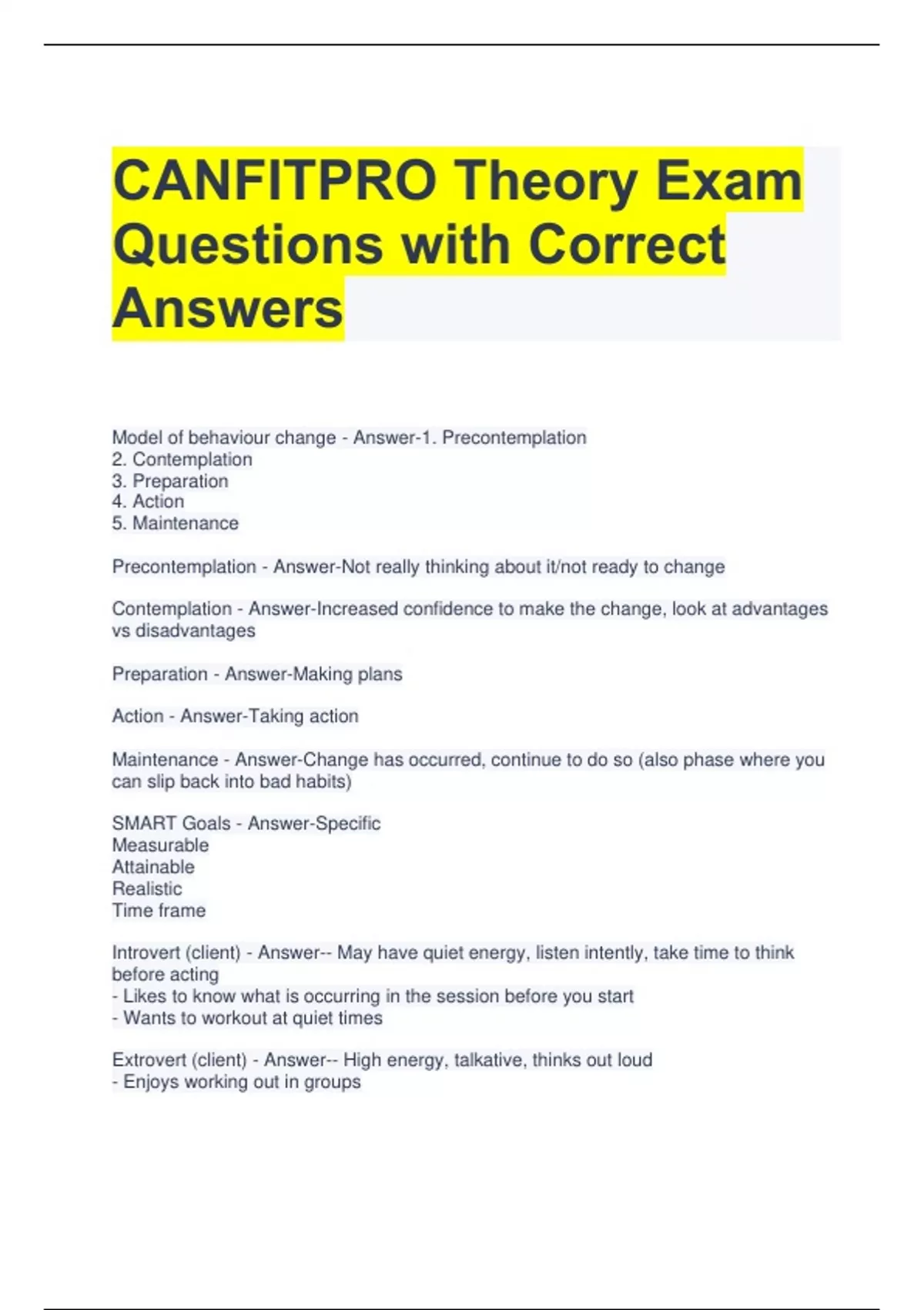 CANFITPRO Theory Exam Questions with Correct Answers Model of behaviour change - Answer-1. Precontemplation 2. Contemplation 3. Preparation 4. Action 5. Maintenance Precontemplation - Answer-Not really thinking about it/not ready to change Contemplation - Answer-Increased confidence to make the change, look at advantages vs disadvantages Preparation - Answer-Making plans Action - Answer-Taking action Maintenance - Answer-Change has occurred, continue to do so (also phase where you can slip back into bad habits) SMART Goals - Answer-Specific Measurable Attainable Realistic Time frame Introvert (client) - Answer-- May have quiet energy, listen intently, take time to think before acting - Likes to know what is occurring in the session before you start - Wants to workout at quiet times Extrovert (client) - Answer-- High energy, talkative, thinks out loud - Enjoys working out in groups Sensors (client) - Answer-- Focuses on details, remembers facts, enjoys step by step instruction Intuitive (client) - Answer-- Enjoys discussing bigger picture and possibilities - Will work at an exercise until they perfect it - Likes to work in bursts of energy - Enjoys learning new skills Thinker (client) - Answer-- Appears cool and reserved and appreciates honest feedback - Likes to know purpose of exercise - Enjoys a healthy debate