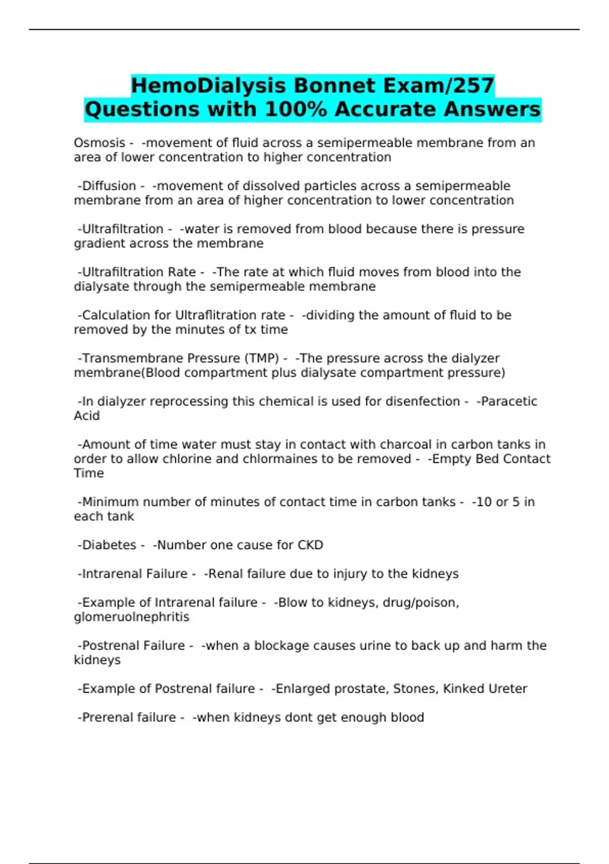 HemoDialysis Bonnet Exam/257 Questions with 100% Accurate Answers