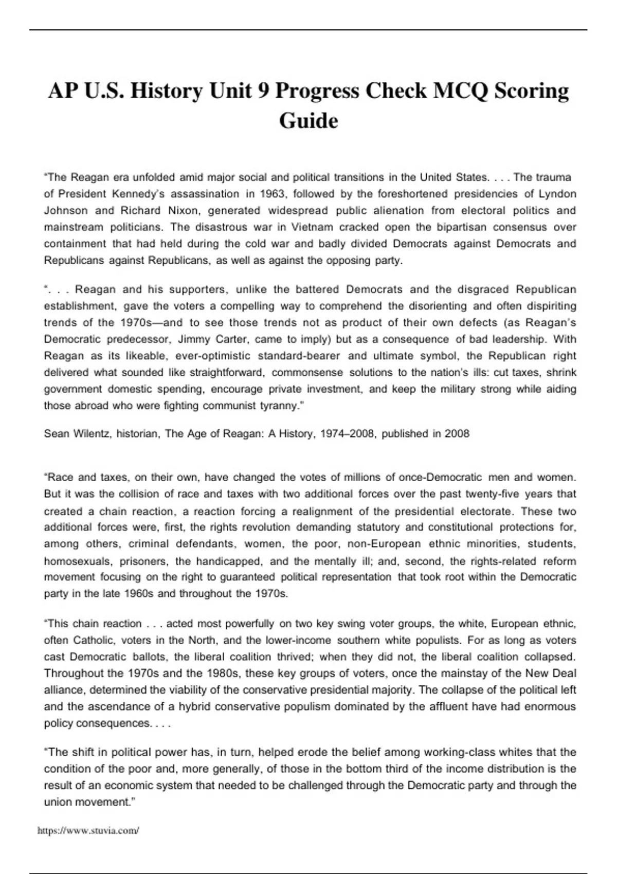 AP U.S. History Unit 9 Progress Check MCQ Scoring Guide.
