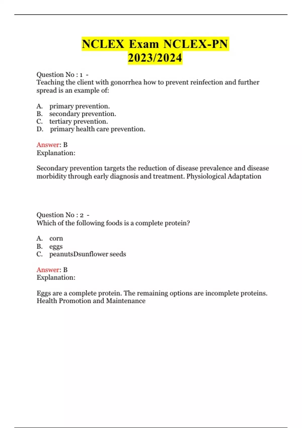 NCLEX Exam NCLEX-PN 2023/2024 Question No : 1 - Teaching the client with gonorrhea how to prevent reinfection and further spread is an example of: A.primary prevention. B.secondary prevention. C.tertiary prevention. D.primary health care prevention. Answer: B Explanation: Secondary prevention targets the reduction of disease prevalence and disease morbidity through early diagnosis and treatment. Physiological Adaptation Question No : 2 - Which of the following foods is a complete protein? A.corn B.eggs C.peanutsDsunflower seeds Answer: B Explanation: Eggs are a complete protein. The remaining options are incomplete proteins. Health Promotion and Maintenance Question No : 3 - Broccoli, oranges, dark greens, and dark yellow vegetables can be eaten to: A.supplement vitamin pills. B.balance body molecules. C.cure many diseases. D.help improve body defenses. Answer: D Explanation: Controversy over what types of food to eat and not eat is still under investigation. Certain foods can help improve body defenses to possibly prevent certain diseases. Nonpharmacological Therapies
