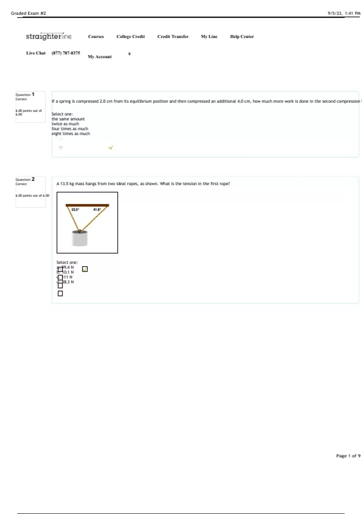 If a spring is compressed 2.0 cm from its equilibrium position and then compressed an additional 4.0 cm, how much more work is done in the second compression than in the first? Select one: a. the same amount b. twice as much c. four times as much d. eight times as much A 13.5 kg mass hangs from two ideal ropes, as shown. What is the tension in the first rope? Select one: a. 99.4 N b. 10.1 N c. 111 N d. 88.3 N