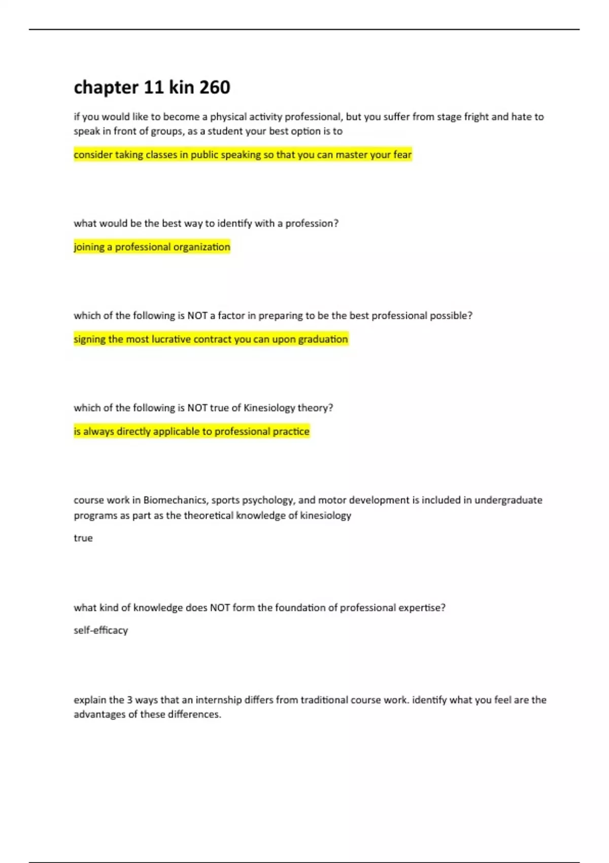 if you would like to become a physical activity professional, but you suffer from stage fright and hate to speak in front of groups, as a student your best option is to consider taking classes in public speaking so that you can master your fear what would be the best way to identify with a profession? joining a professional organization which of the following is NOT a factor in preparing to be the best professional possible? signing the most lucrative contract you can upon graduation which of the following is NOT true of Kinesiology theory? is always directly applicable to professional practice