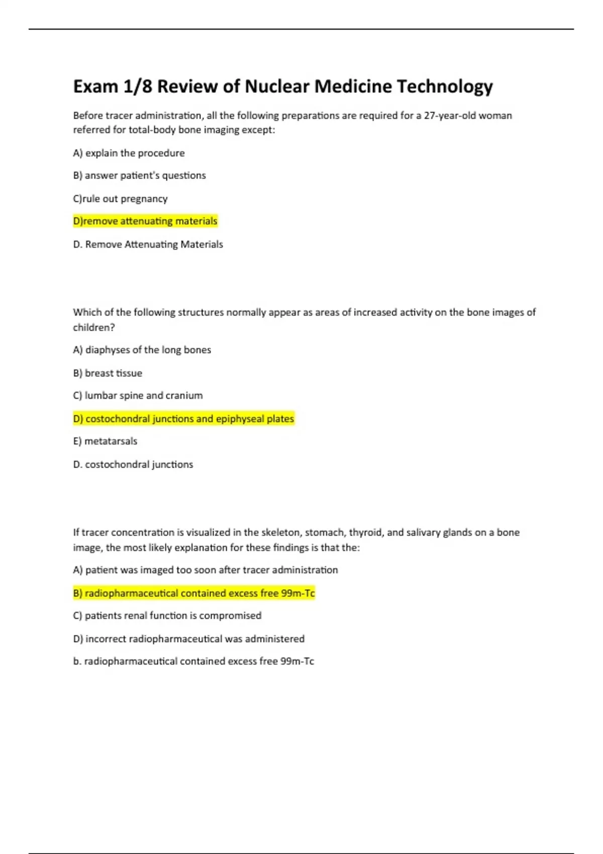 Before tracer administration, all the following preparations are required for a 27-year-old woman referred for total-body bone imaging except: A) explain the procedure B) answer patient's questions C)rule out pregnancy D)remove attenuating materials D. Remove Attenuating Materials Which of the following structures normally appear as areas of increased activity on the bone images of children? A) diaphyses of the long bones B) breast tissue C) lumbar spine and cranium D) costochondral junctions and epiphyseal plates E) metatarsals D. costochondral junctions