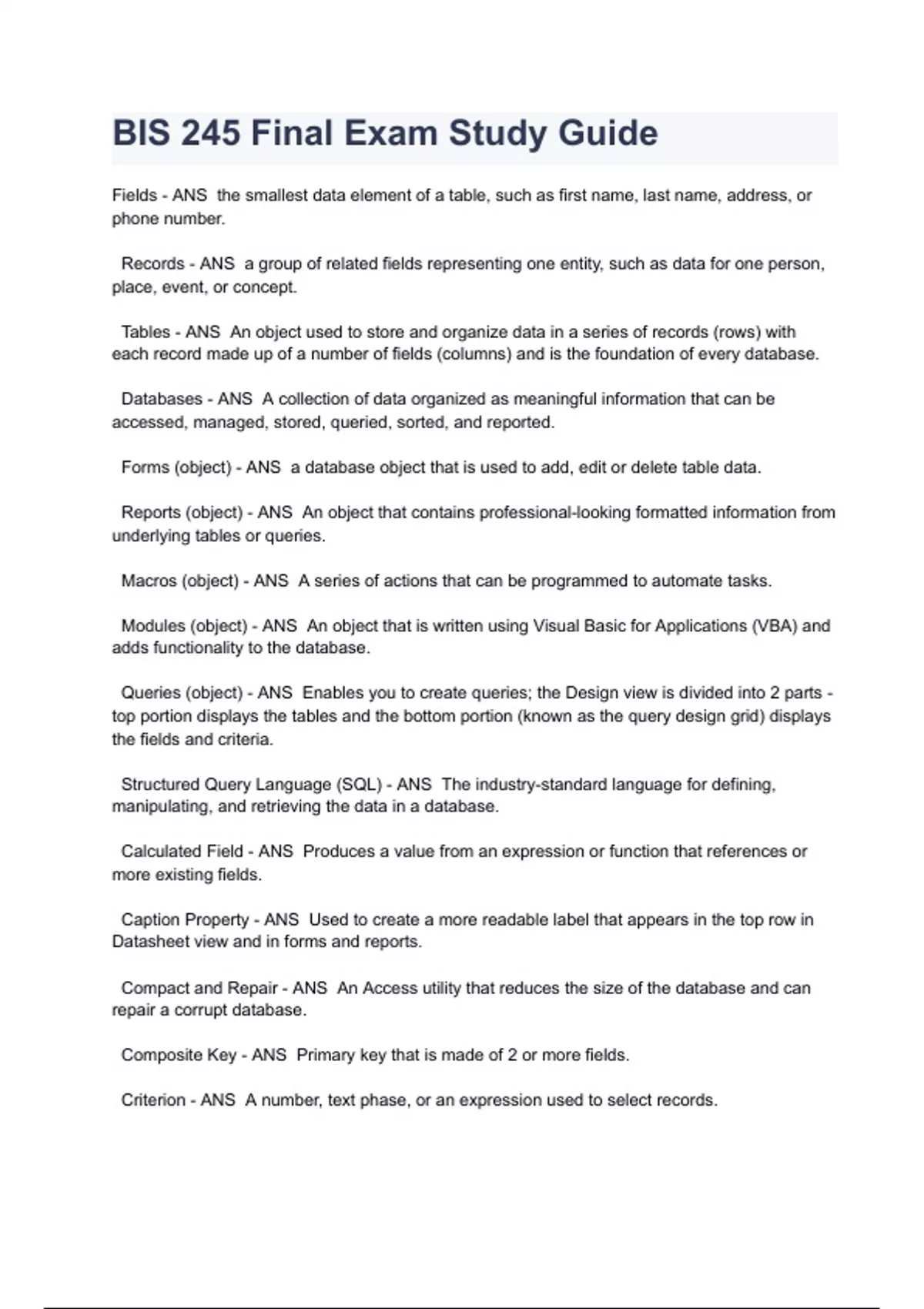 BIS 245 Final Exam Study Guide Fields - ANS the smallest data element of a table, such as first name, last name, address, or phone number. Records - ANS a group of related fields representing one entity, such as data for one person, place, event, or concept. Tables - ANS An object used to store and organize data in a series of records (rows) with each record made up of a number of fields (columns) and is the foundation of every database. Databases - ANS A collection of data organized as meaningful information that can be accessed, managed, stored, queried, sorted, and reported. Forms (object) - ANS a database object that is used to add, edit or delete table data. Reports (object) - ANS An object that contains professional-looking formatted information from underlying tables or queries. Macros (object) - ANS A series of actions that can be programmed to automate tasks. Modules (object) - ANS An object that is written using Visual Basic for Applications (VBA) and adds functionality to the database.