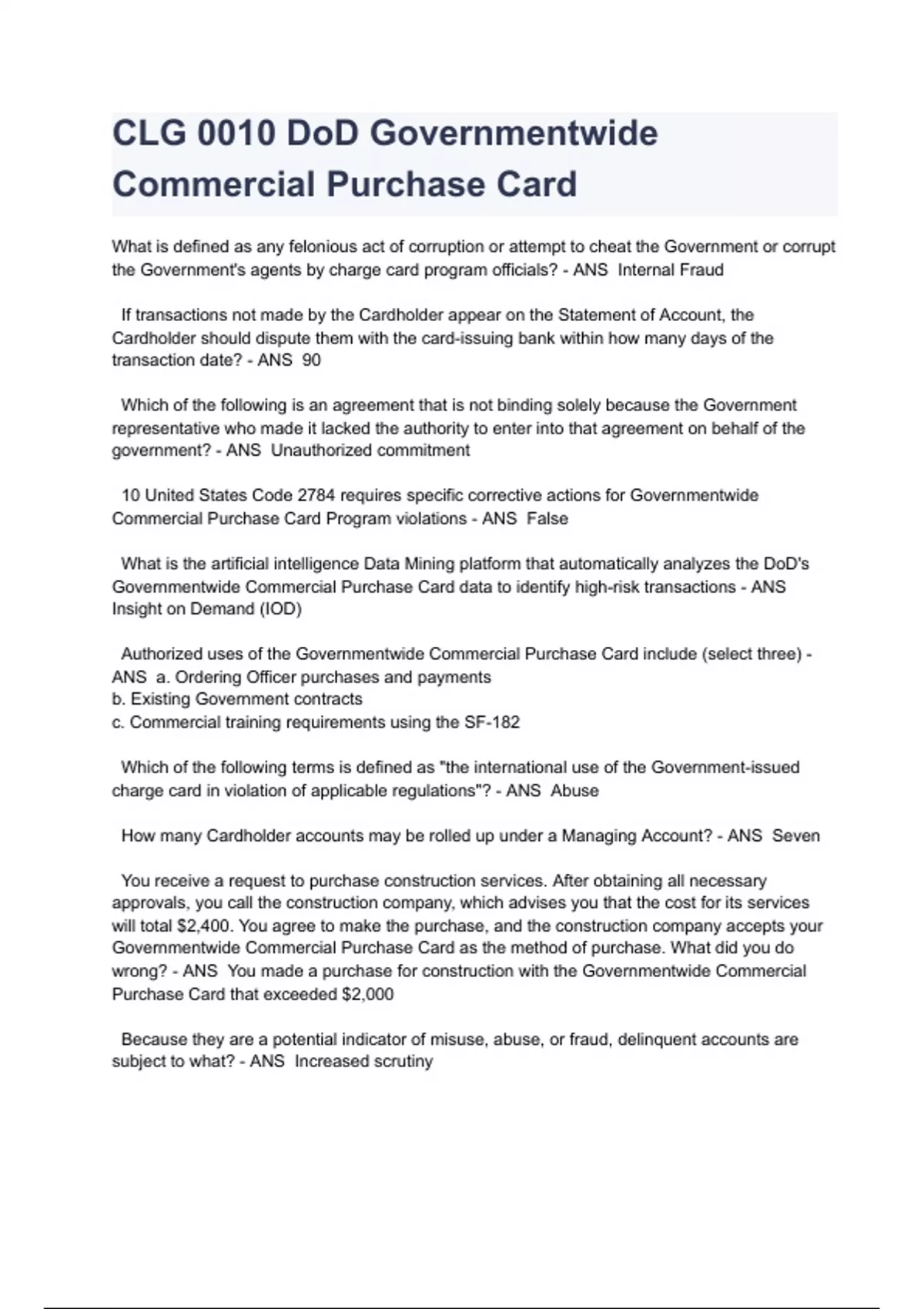 CLG 0010 DoD Governmentwide Commercial Purchase Card What is defined as any felonious act of corruption or attempt to cheat the Government or corrupt the Government's agents by charge card program officials? - ANS Internal Fraud If transactions not made by the Cardholder appear on the Statement of Account, the Cardholder should dispute them with the card-issuing bank within how many days of the transaction date? - ANS 90 Which of the following is an agreement that is not binding solely because the Government representative who made it lacked the authority to enter into that agreement on behalf of the government? - ANS Unauthorized commitment 10 United States Code 2784 requires specific corrective actions for Governmentwide Commercial Purchase Card Program violations - ANS False What is the artificial intelligence Data Mining platform that automatically analyzes the DoD's Governmentwide Commercial Purchase Card data to identify high-risk transactions - ANS Insight on Demand (IOD) Authorized uses of the Governmentwide Commercial Purchase Card include (select three) - ANS a. Ordering Officer purchases and payments b. Existing Government contracts c. Commercial training requirements using the SF-182 Which of the following terms is defined as "the international use of the Government-issued charge card in violation of applicable regulations"? - ANS Abuse How many Cardholder accounts may be rolled up under a Managing Account? - ANS Seven You receive a request to purchase construction services. After obtaining all necessary approvals, you call the construction company, which advises you that the cost for its services will total $2,400. You agree to make the purchase, and the construction company accepts your Governmentwide Commercial Purchase Card as the method of purchase. What did you do wrong? - ANS You made a purchase for construction with the Governmentwide Commercial Purchase Card that exceeded $2,000 Because they are a potential indicator of misuse, abuse, or fraud, delinquent accounts are subject to what? - ANS Increased scrutiny