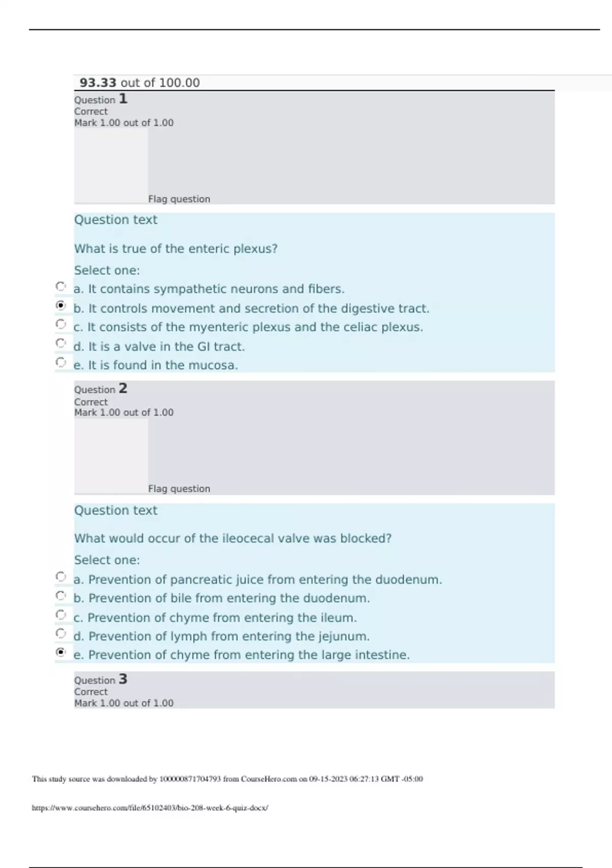 Question text What is true of the enteric plexus? Select one: a. It contains sympathetic neurons and fibers. b. It controls movement and secretion of the digestive tract. c. It consists of the myenteric plexus and the celiac plexus. d. It is a valve in the GI tract. e. It is found in the mucosa. Question 2 Correct Mark 1.00 out of 1.00 Flag question Question text What would occur of the ileocecal valve was blocked? Select one: a. Prevention of pancreatic juice from entering the duodenum. b. Prevention of bile from entering the duodenum. c. Prevention of chyme from entering the ileum. d. Prevention of lymph from entering the jejunum. e. Prevention of chyme from entering the large intestine. Question 3 Correct Mark 1.00 out of 1.00 This study source was downloaded by