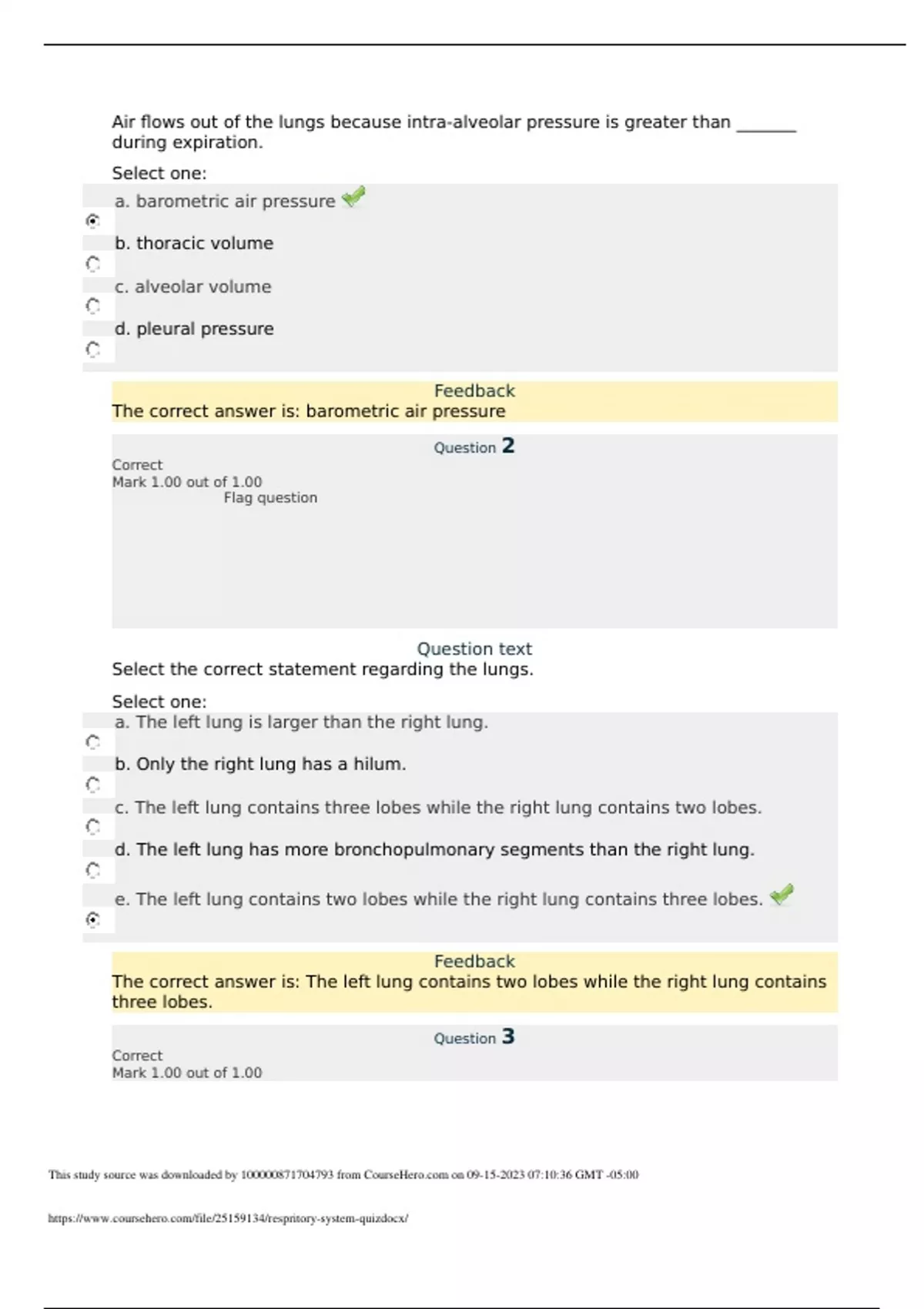 Air flows out of the lungs because intra-alveolar pressure is greater than _______ during expiration. Select one: a. barometric air pressure b. thoracic volume c. alveolar volume d. pleural pressure Feedback The correct answer is: barometric air pressure Question 2 Correct Mark 1.00 out of 1.00 Flag question Question text Select the correct statement regarding the lungs. Select one: a. The left lung is larger than the right lung. b. Only the right lung has a hilum. c. The left lung contains three lobes while the right lung contains two lobes. d. The left lung has more bronchopulmonary segments than the right lung. e. The left lung contains two lobes while the right lung contains three lobes. Feedback The correct answer is: The left lung contains two lobes while the right lung contains three